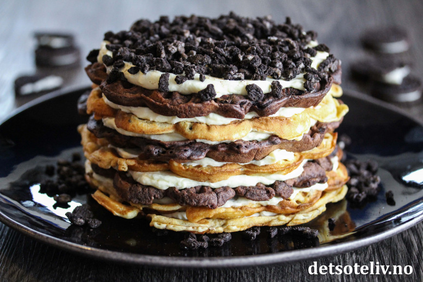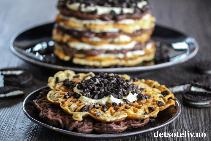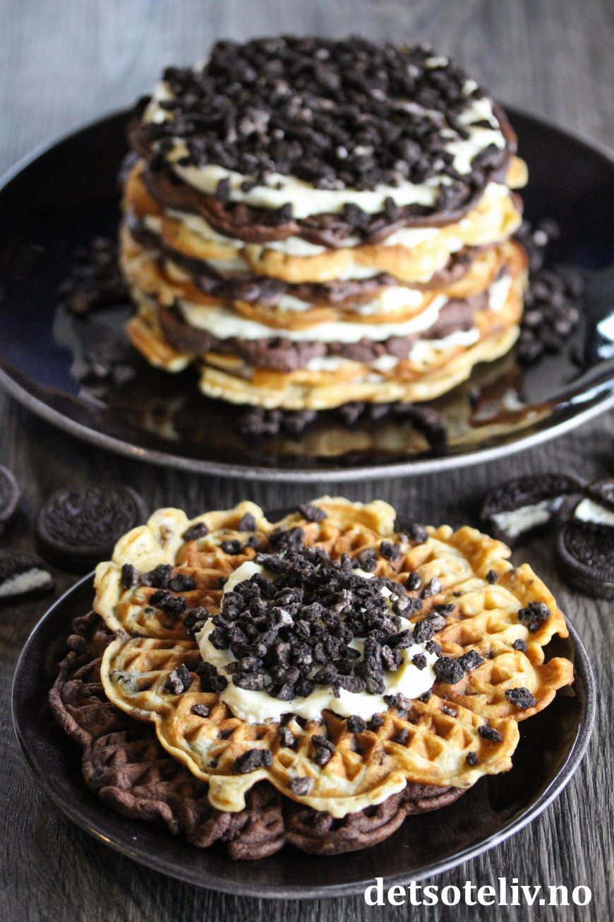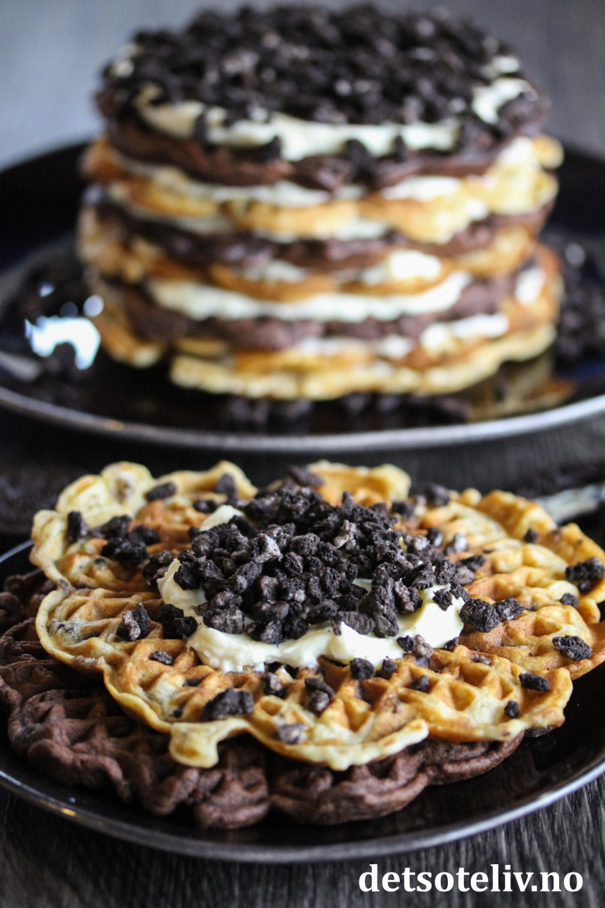 Jeg har laget herlige luksusvafler med hakkede Oreos, noen lyse og noen med ekstra sjokolade, som jeg har lagt oppå hverandre med luftig ostekrem mellom lagene.