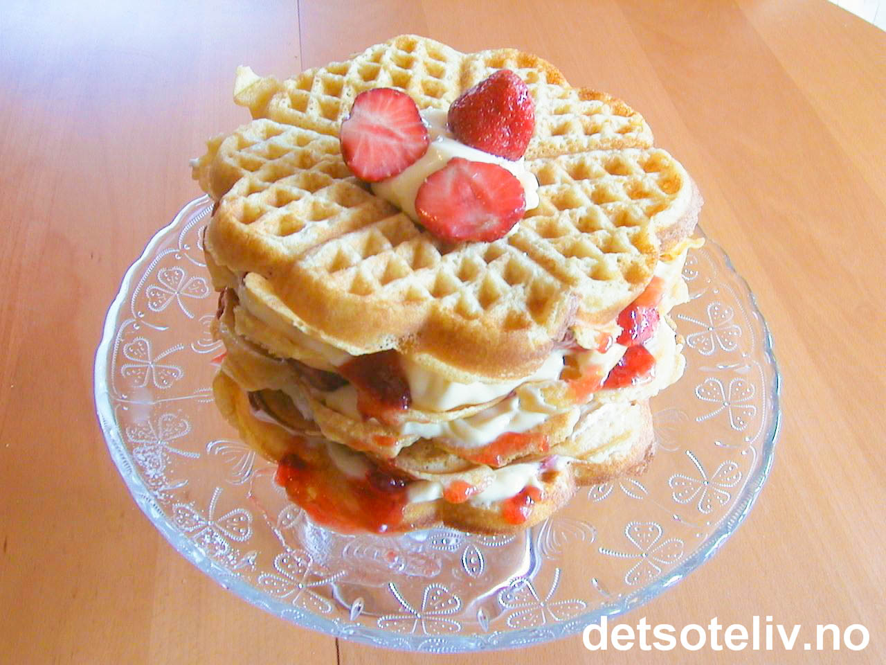 Du får 7-8 vaffelplater av denne porsjonen. Bruk de 5 fineste til å lage "Vaffelkaken". De øvrige kan du spare til senere (eller gumle på mens du steker...).