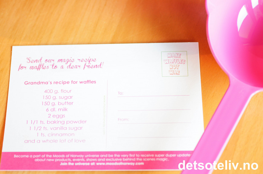 Og oppi esken med vaffeljernet finner du en øse med en størrelse som er perfekt tilpasset mengden vaffelrøre du trenger per vaffelplate. Dessuten finner du et postkort med vaffeloppskriften: