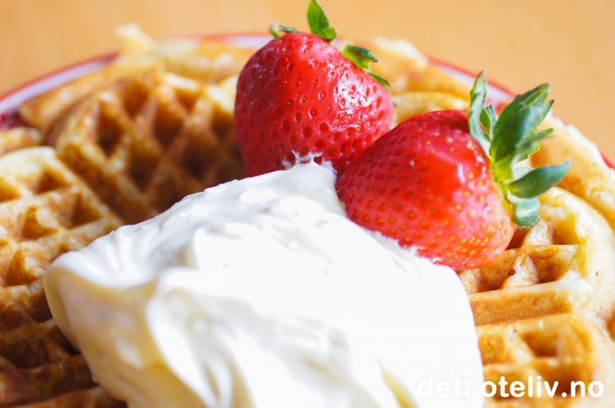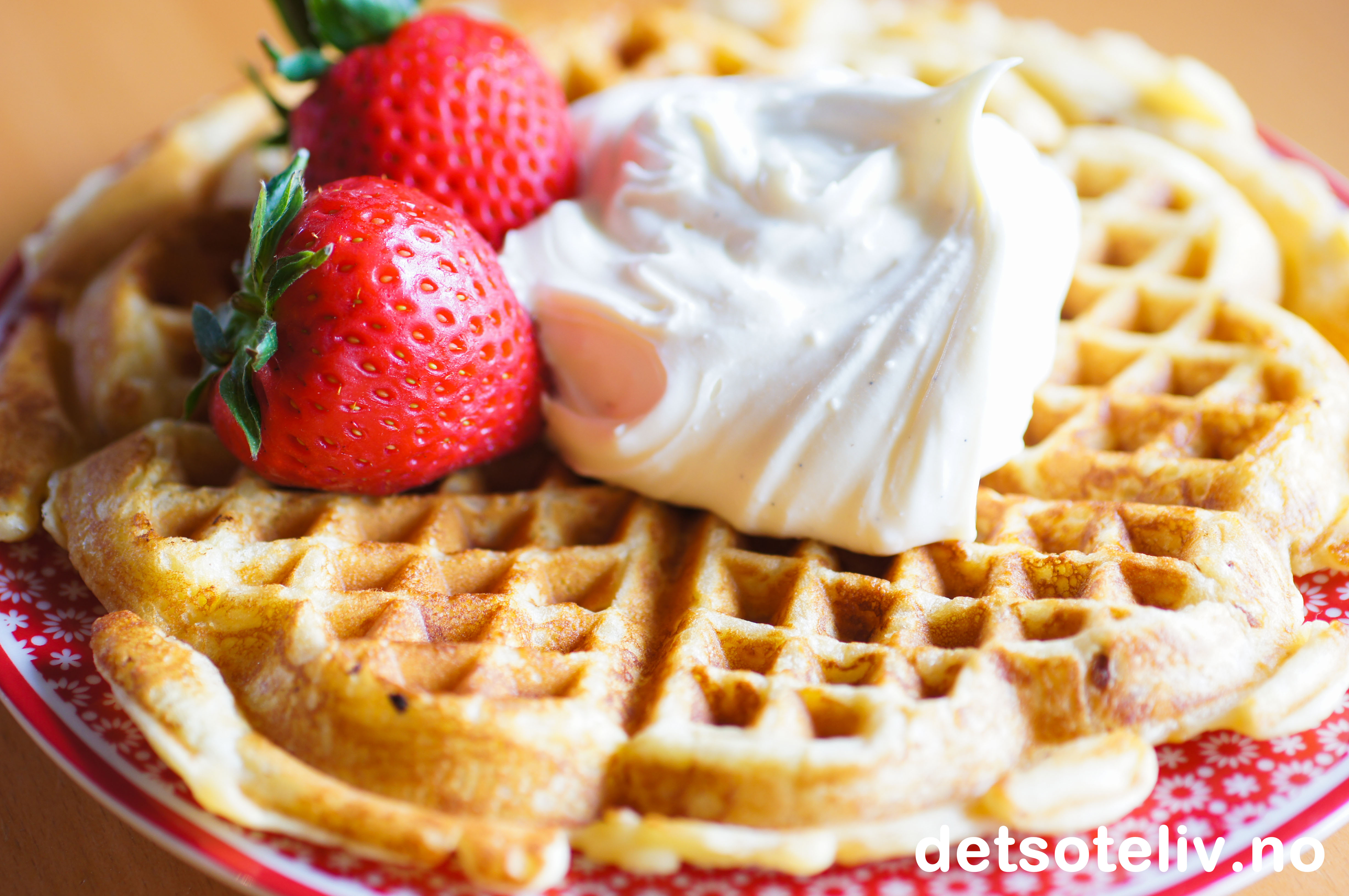 ♥ Jeg har her brukt oppskriften på Perfekte vafler som tidligere er publisert her på Det søte liv. Disse vaflene er myke og kjempegode, men husk at mascarponekrem og jordbær smaker godt til alle slags vafler.