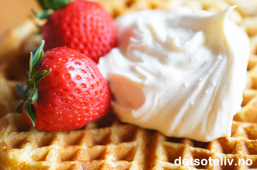 Dette er myke vafler som blir ekstra gode om de serveres med mascarponekrem og søte, friske jordbær.