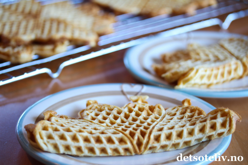 Stek vafler i vaffeljern på middels varme. Bruk litt smør eller formfett under stekingen.