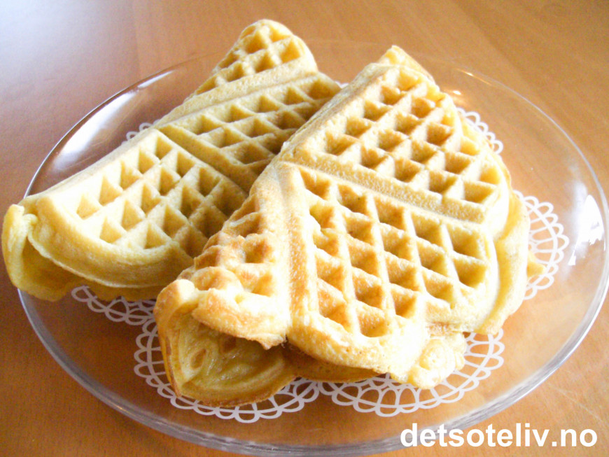Stek vafler i vaffeljern på middels varme. Bruk litt formspray i vaffeljernet mellom vaffelplatene.