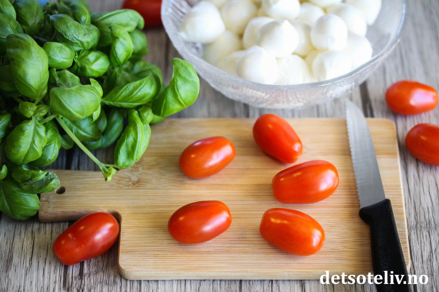 Finn frem tomater, mozzarella og basilikum. Hell laken fra mozzarellakulene og legg dem i en skål.