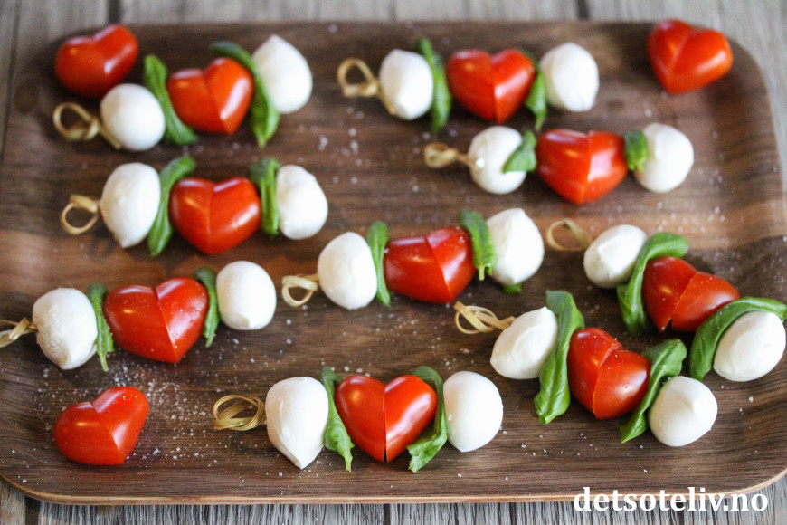 Lag spydene ved å først tre på en mozzarellakule, så et basilikumblad, så hjertet bestående av de to tomathalvdelene, så et basilikumblad til og til slutt en siste mozzarellakule.