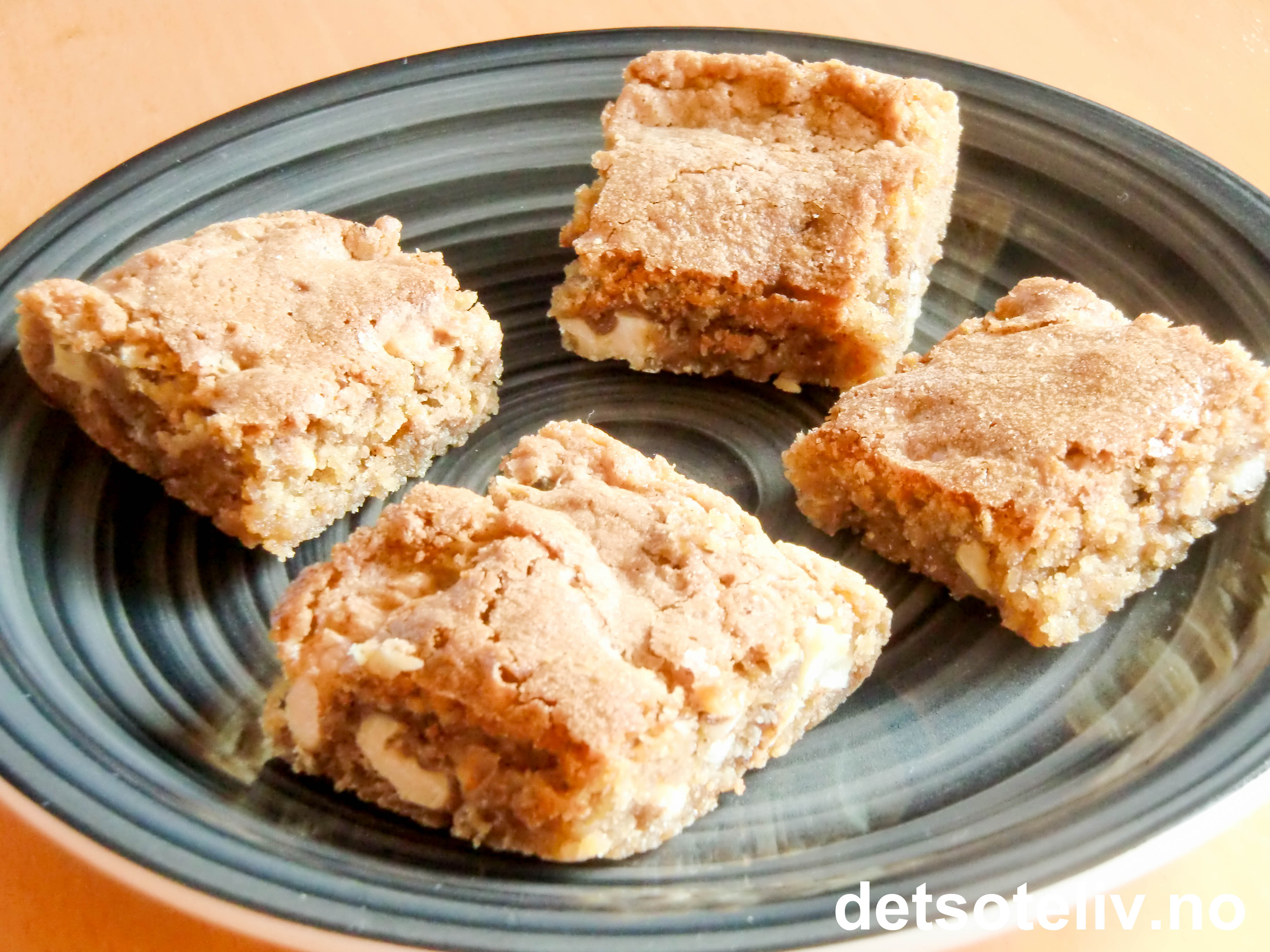 Ha deigen i en liten, bakepapirkledd langpanne (ca 20x30 cm). Stek kakene midt i ovnen ved 180°C i ca 30 min (kaken skal være gjennomstekt, men fortsatt litt bløt i midten).