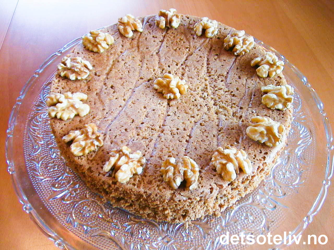 Løsne kaken fra formen ved å skjære forsiktig langsmed kanten med en skarp kniv. Ta kaken ut av formen og fjern bakepapiret. Sett kaken på et passende fat og pynt med hele valnøttkjerner. Server gjerne sammen med søt, pisket krem.