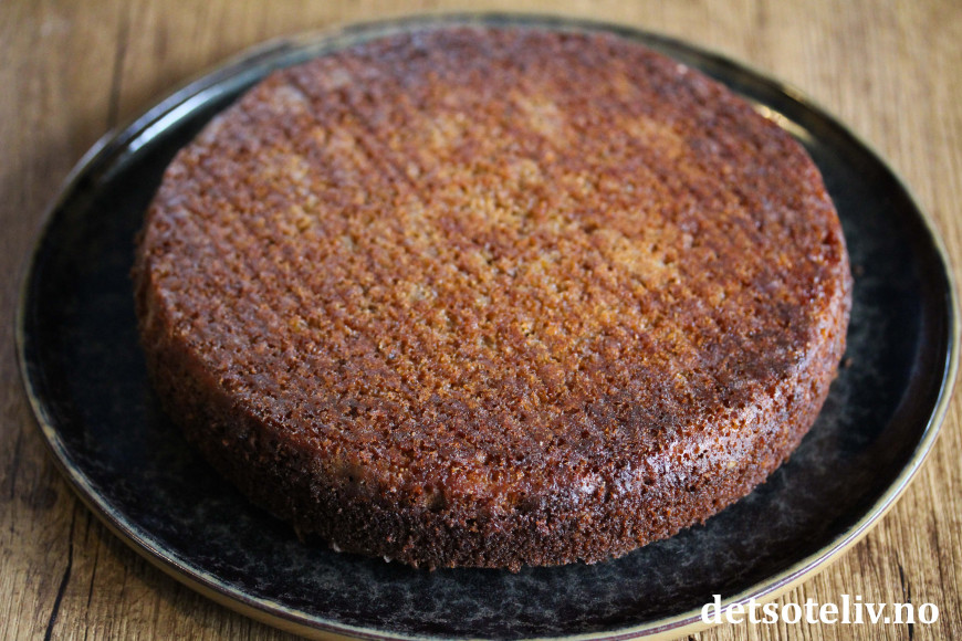 Ha deigen i en rund form (22 cm i diameter) med bakepapir i bunnen. Stek kaken midt i ovnen ved 180 °C i ca. 35 minutter (sjekk med kakenål at kaken er gjennomstekt i midten før du tar den ut av formen). Avkjøl kaken i formen til den er helt kald. Flytt den deretter over på et fat.