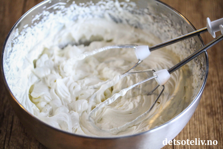 Pisk blandingen sammen til du få en fast og fløyelsmyk mascarponekrem.