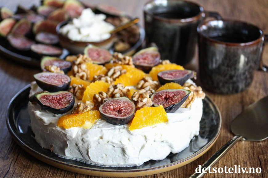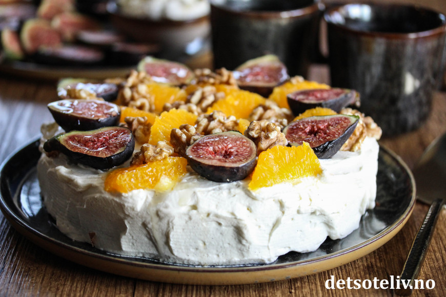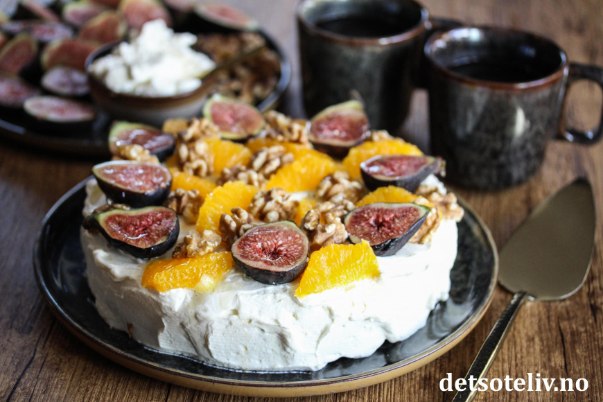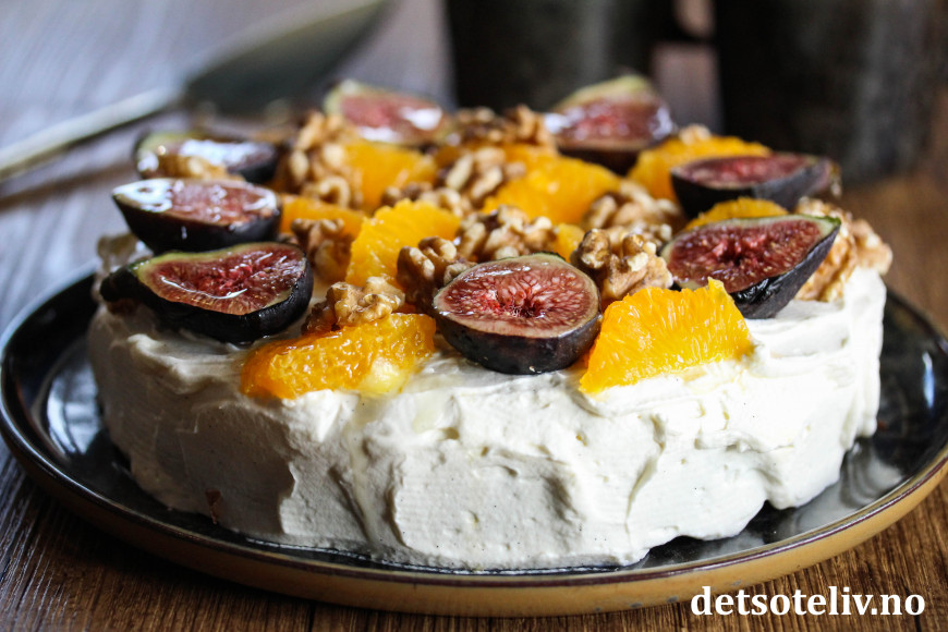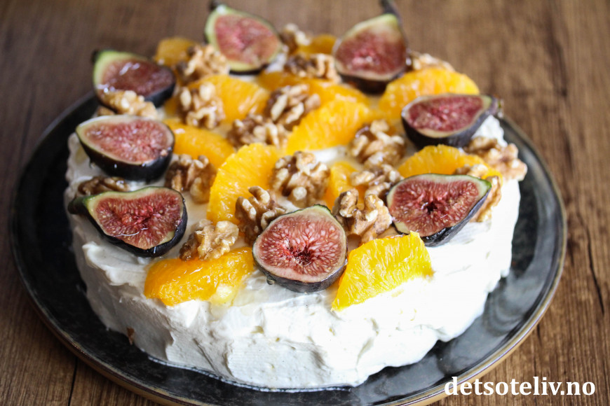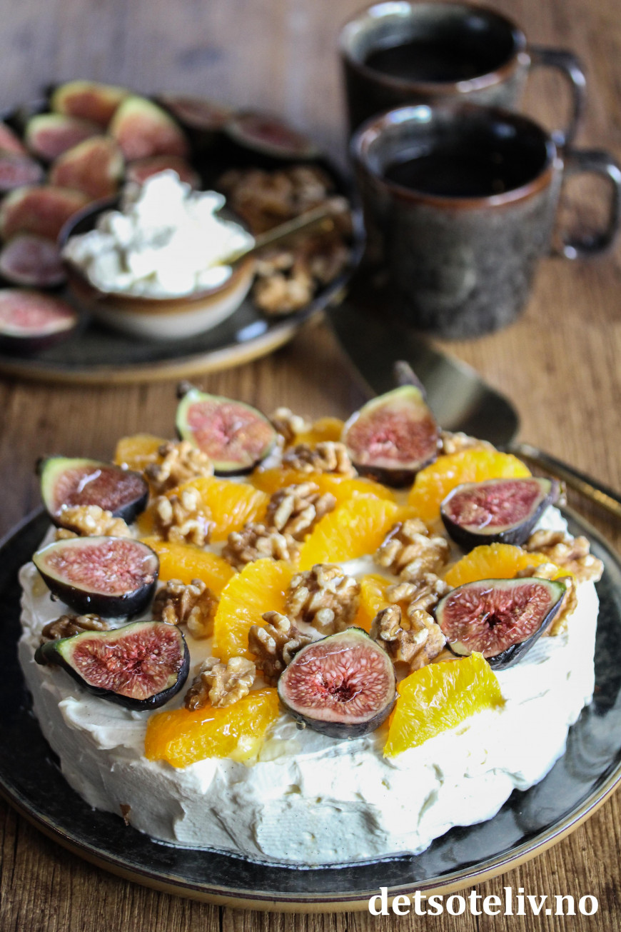 ♥ Valnøttkakebunnen kan gjerne lages i forveien. Pakk den da godt inn i plast så den ikke blir tørr. Kaken kan også fryses. Kaken bør imidlertid serveres samme dag som den pyntes med mascarponekrem, appelsinbåter og fiken.