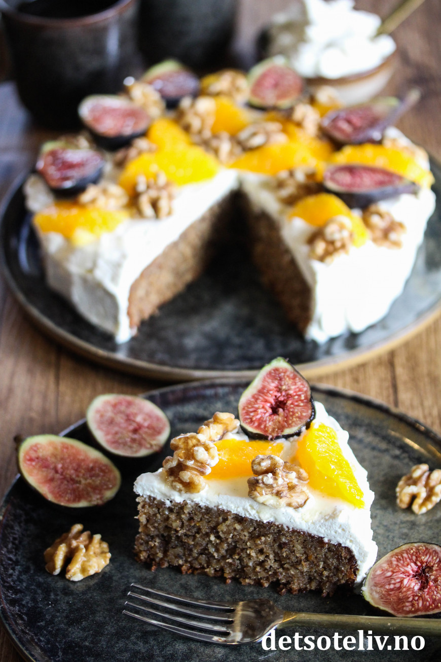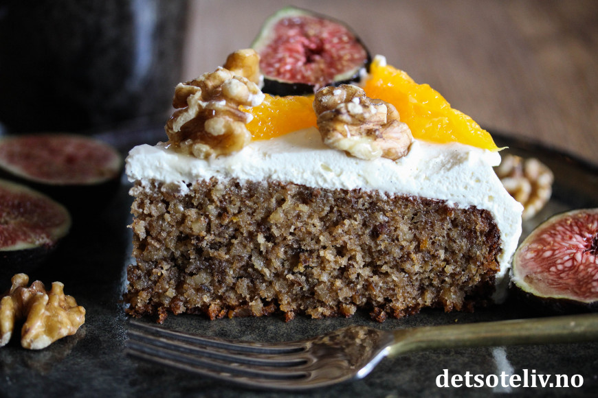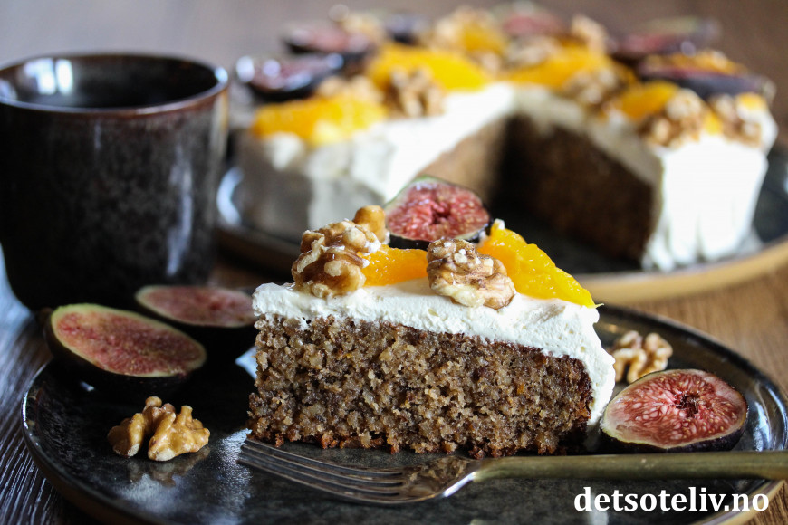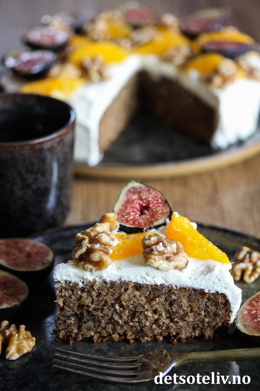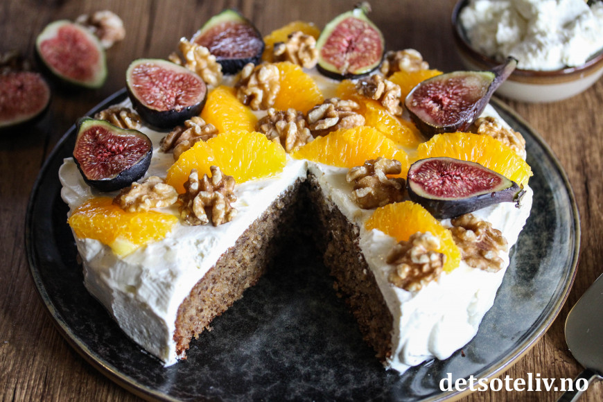 Bunnen er usedvanlig saftig og smaker herlig av valnøtter og appelsin – som er en herlig smakskombinasjon. Kaken dekkes med en vidunderlig god mascarponekrem som er smaksatt med vanilje. På toppen pyntes kaken med hele valnøttkjerner, saftige appelsinskiver og ferske fiken.