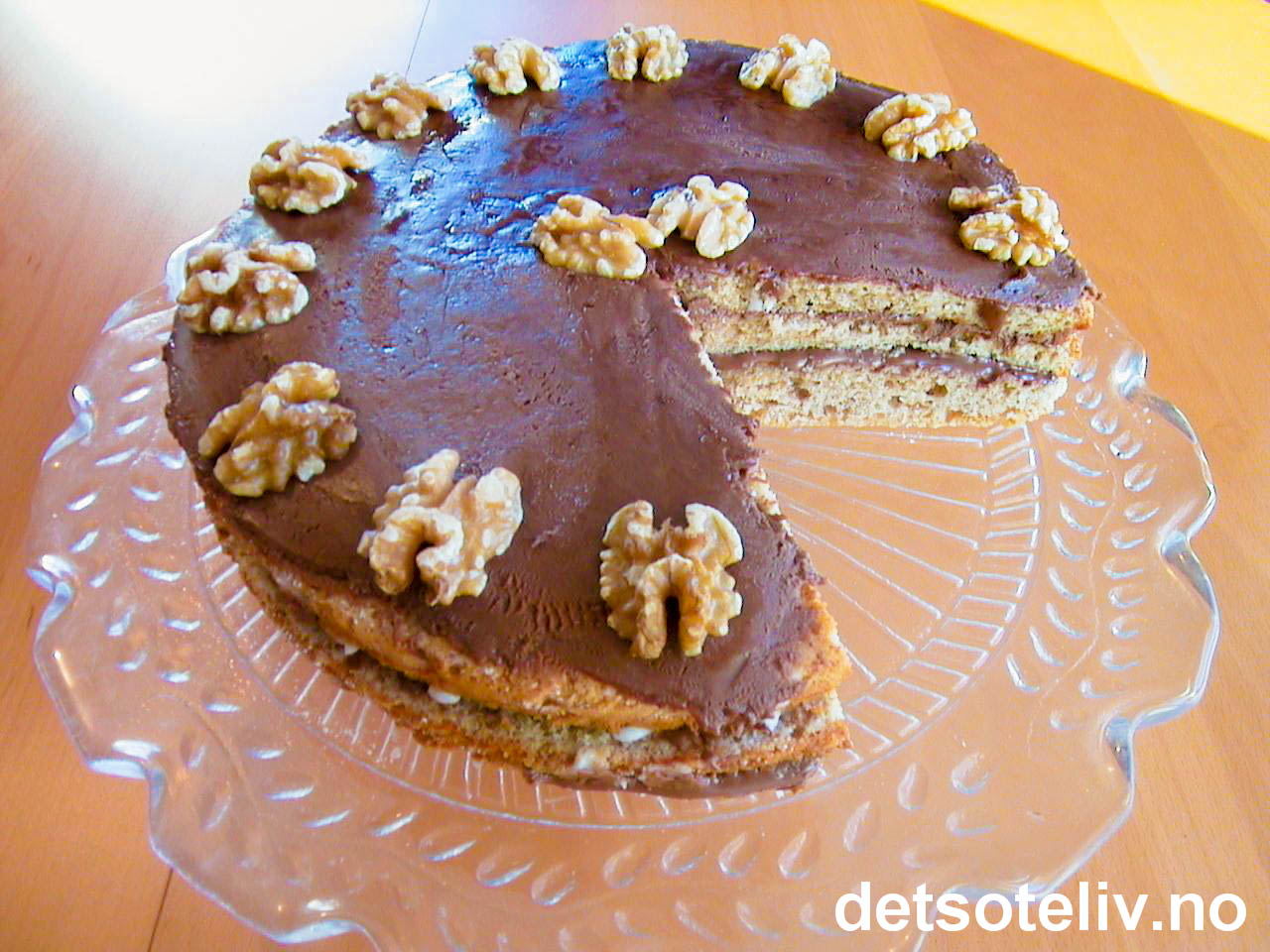 Fyll og dekk kaken med romtemperert "Sjokonøtt" sjokoladepålegg (se tips). Pynt kaken eventuelt med hele valnøttkjerner.