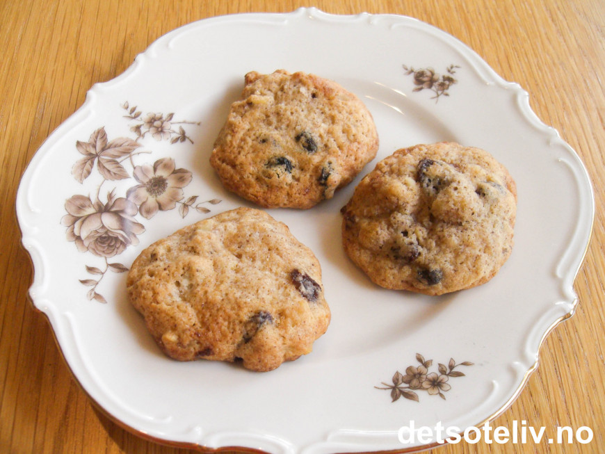 Pisk mykt smør og sukker til smørkrem. Pisk inn eggene. Sikt i bakepulver, kanel og hvetemel og bland deigen sammen. Bland til slutt i grovt hakkede rosiner og valnøtter. Sett deigen i kjøleskapet i 30 min dersom du synes den virker svært bløt i konsistensen.