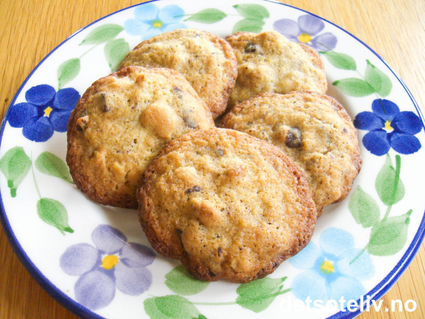 Stek kakene midt i ovnen ved 200°C i ca 10 min, eller til de er gyldne. Avkjøl kakene en stund på platen før de forsiktig flyttes over på rist med en stekespade og avkjøles helt.