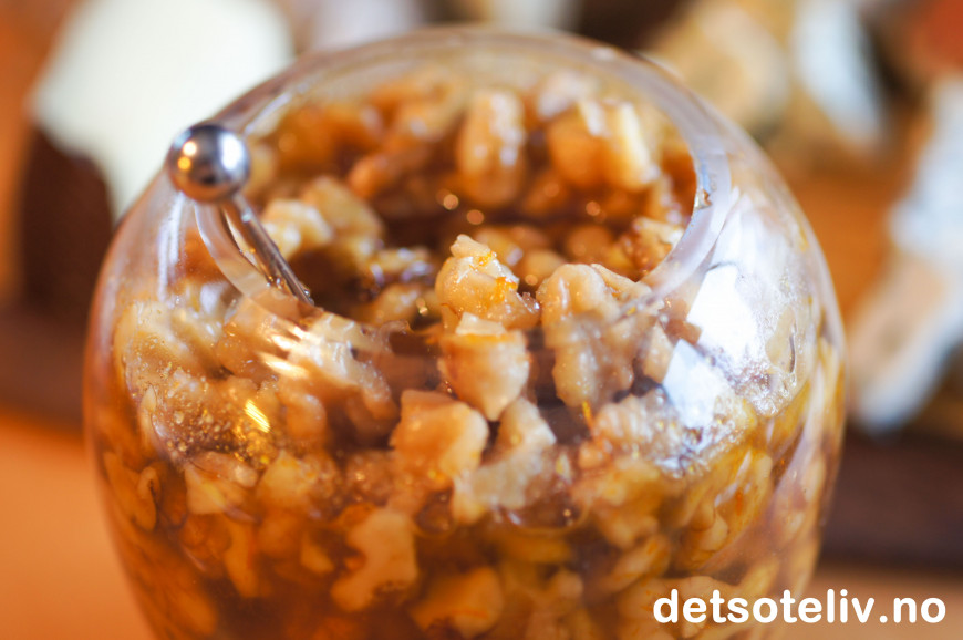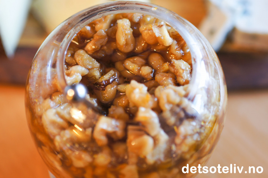 Laken legger seg i bunnen av krukken, så server den en skje så man får med seg både valnøtter og litt av den deilige appelsin-/honninglaken.