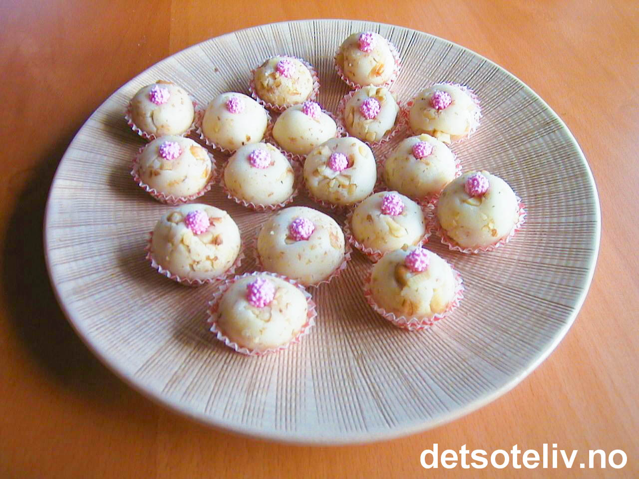 Form valnøttmarsipanen til kuler. Sett kulene i små papirformer. Pynt med en sukkerperle, eller annen type kakepynt.