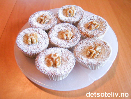 Sett doble papirformer på stekeplate og fyll formene 3/4 fulle. Stekes på nederste rille ved 225°C i 10 min. Avkjøl. Fjern ekstra papirformer som er løse. Sikt over melis og pynt eventuelt med hele valnøttkjerner før servering.