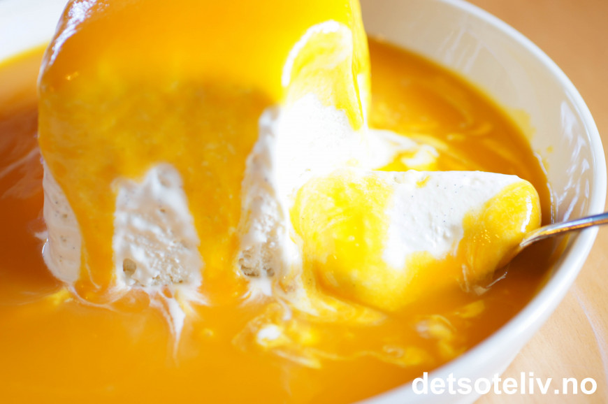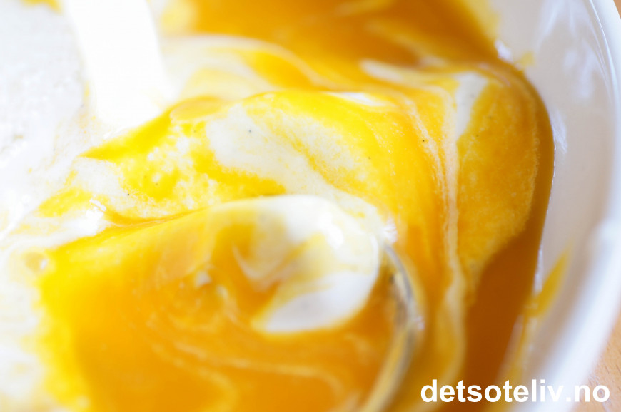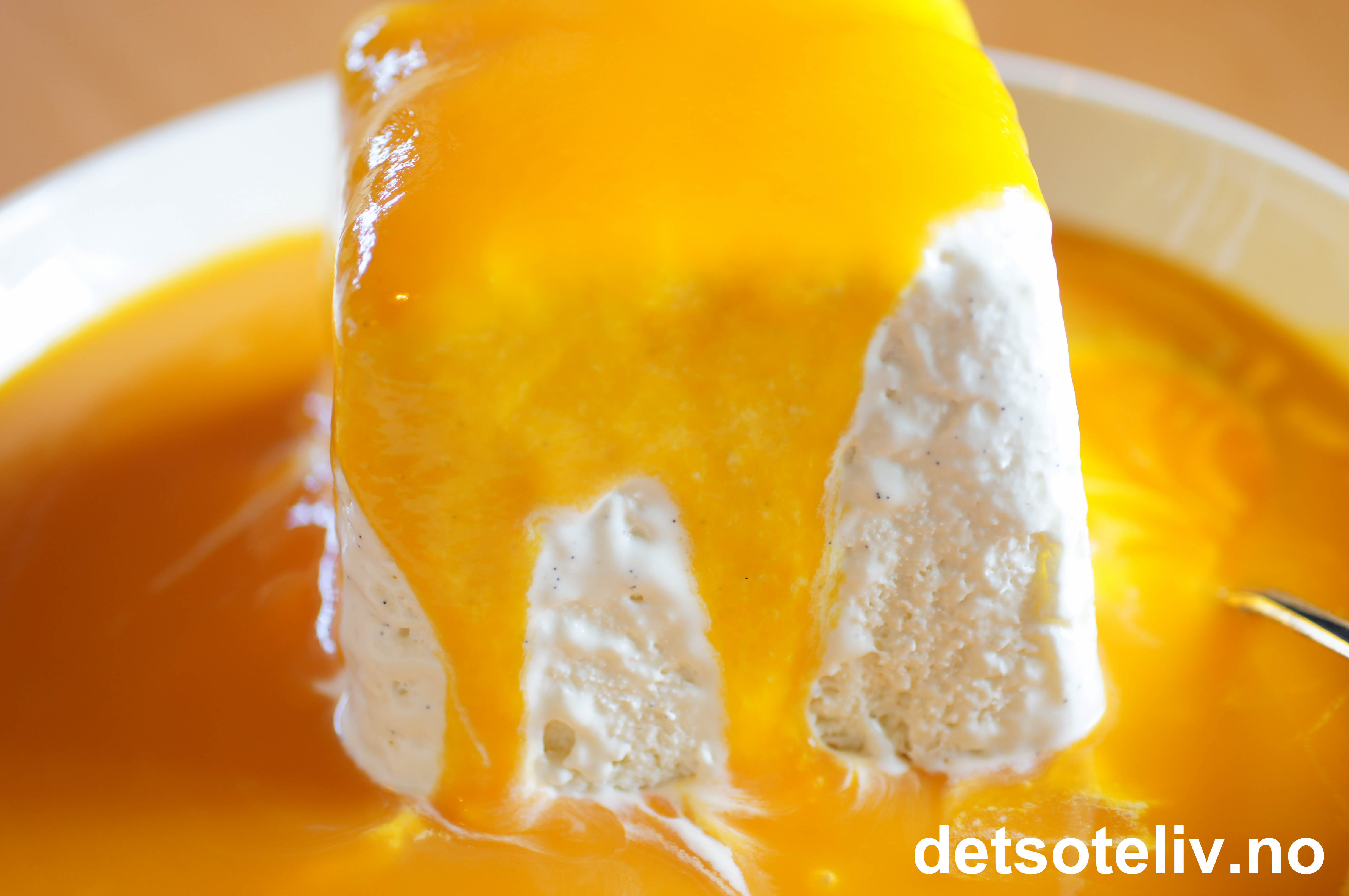 Etter hvert som desserten står på bordet og man forsyner seg, smelter isen mer og mer og blander seg med mango pulpen. Da er desserten bare ENDA BEDRE