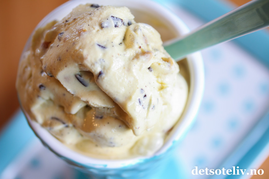 Her har jeg tatt utgangspunkt i en kjempefin grunnoppskrift på deilig vaniljeiskrem med ekte vanilje, og så tilsatt hakket mørk sjokolade og salte peanøtter.