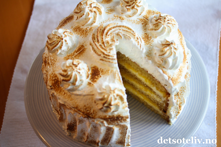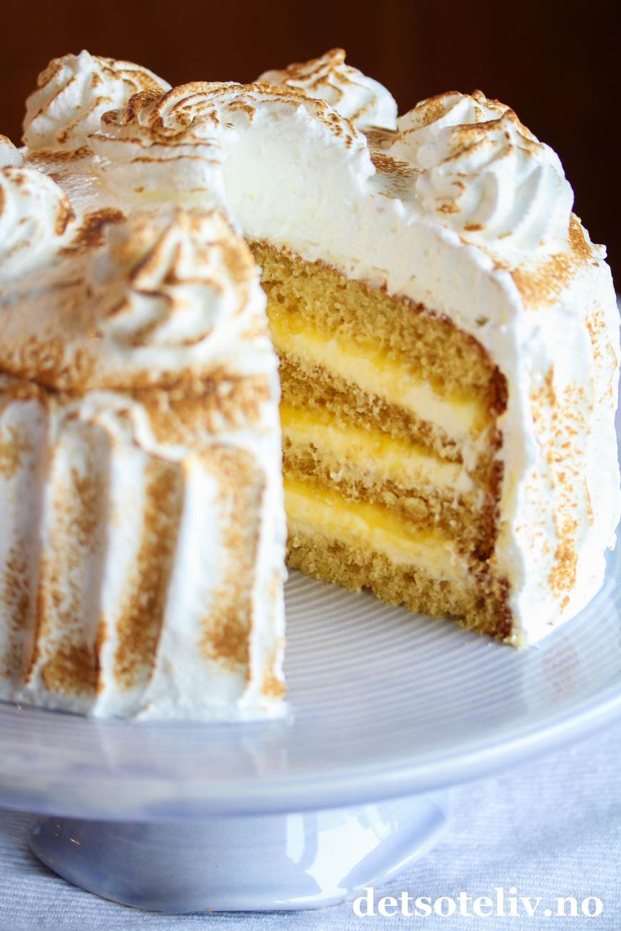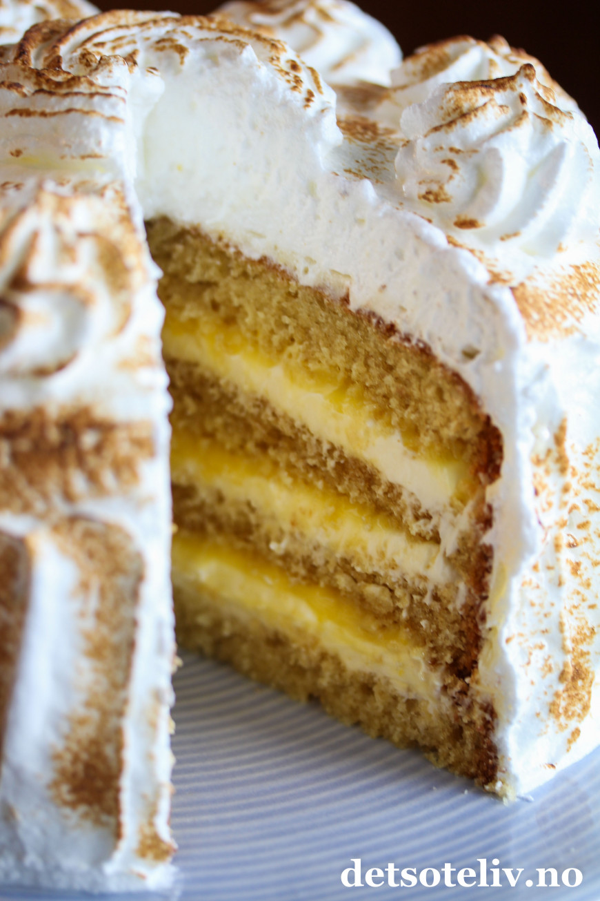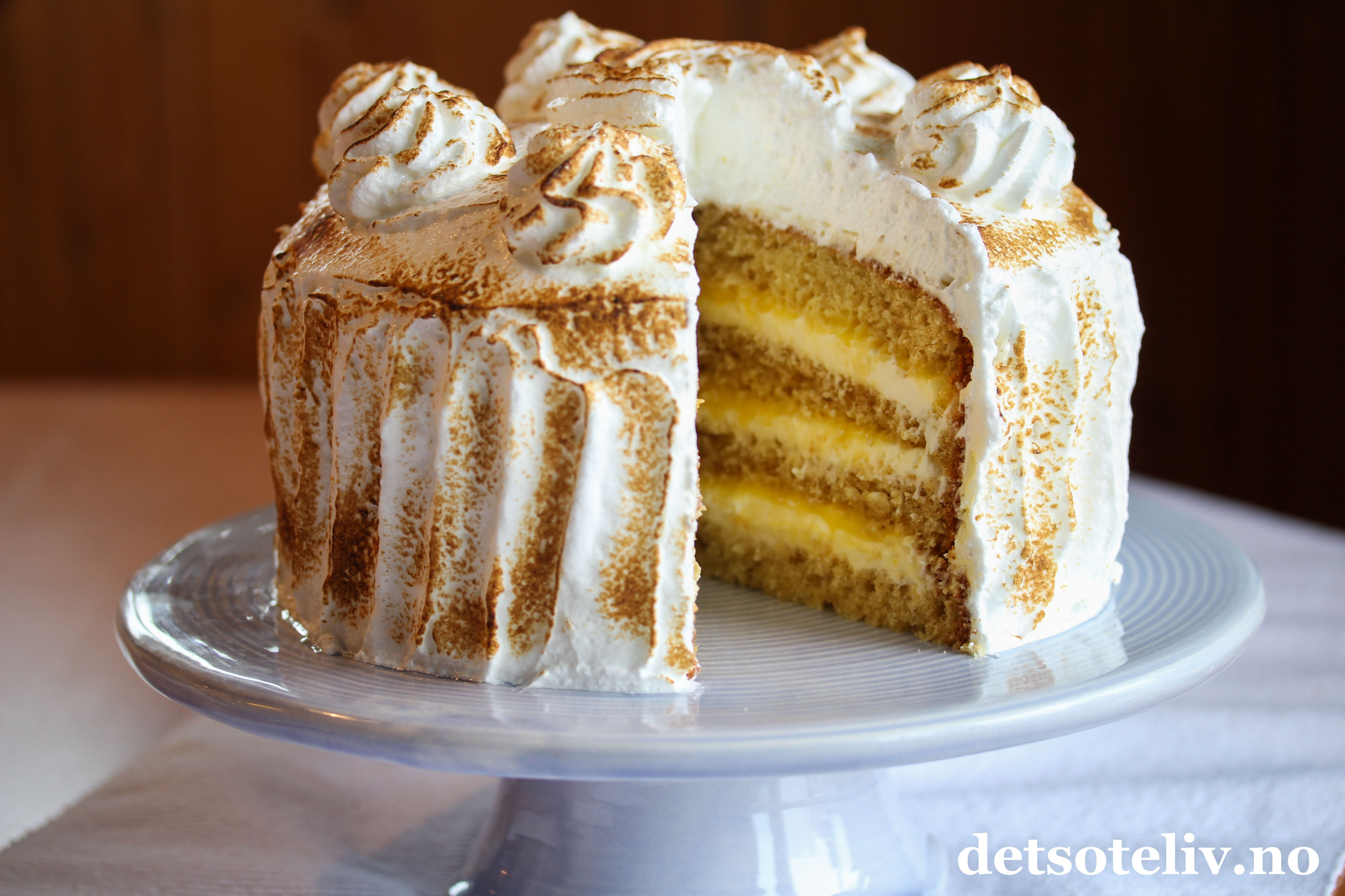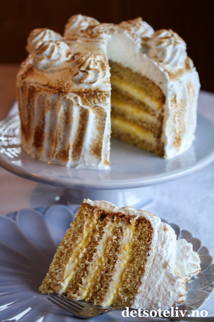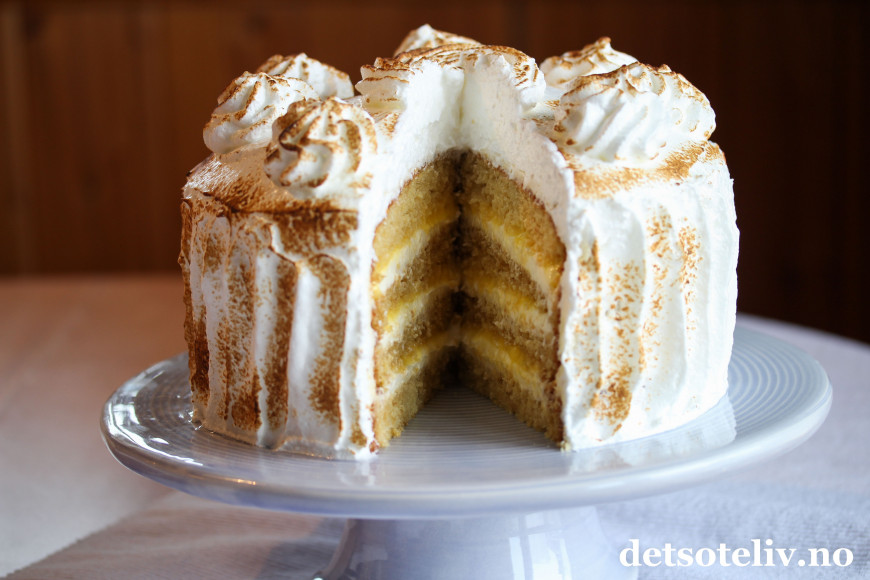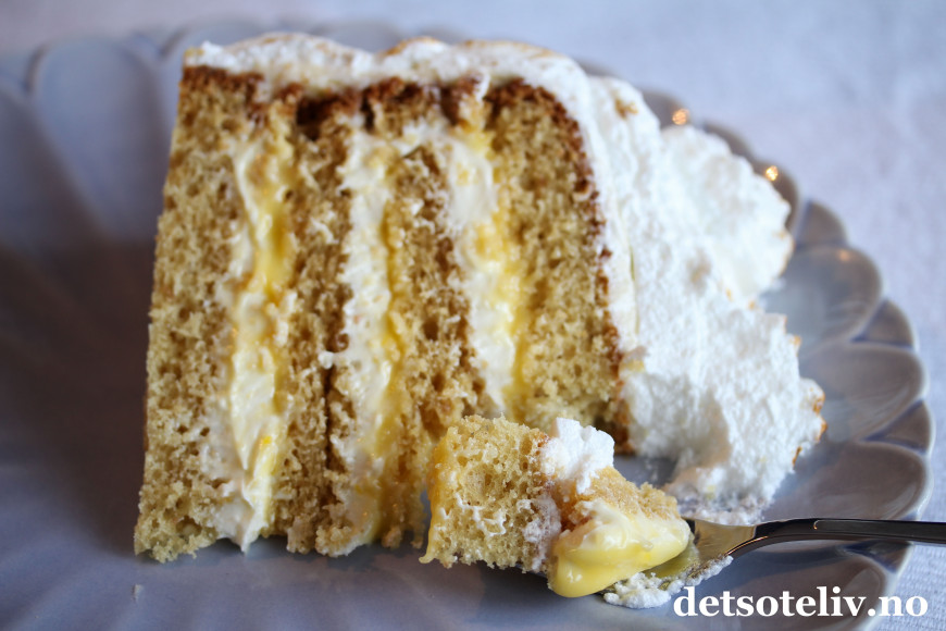 Sitronkrem og marengs er en kombinasjon jeg aldri blir lei. Her finner du denne vellykkede kombinasjonen i en høy og flott vaniljekake, som dessuten også fylles med ostekrem og smørkrem.