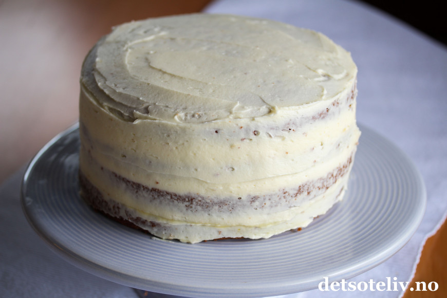 Pisk sammen ingrediensene til smørkremen og smør den i et tynt lag over hele kaken. Sett kaken i kjøleskapet i et par timer så den får satt seg.