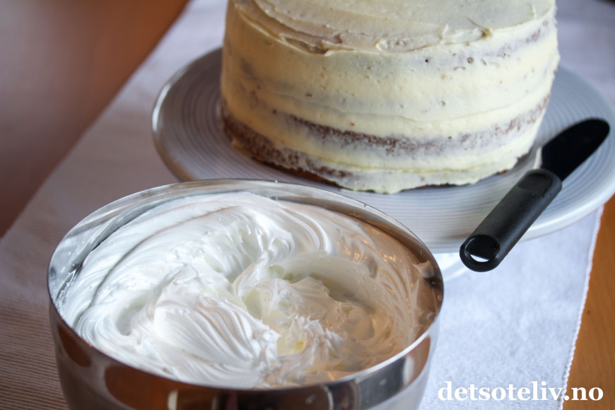 Pisk sammen ingrediensene til smørkremen og smør den i et tynt lag over hele kaken.