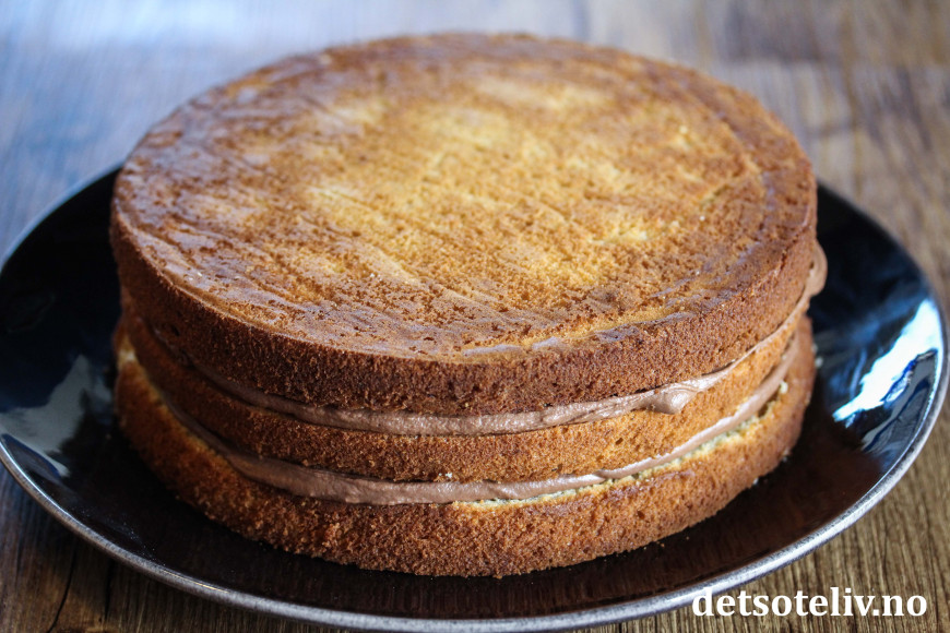 Legg dem sammen med sjokoladekrem imellom. Ha så et godt lag sjokoladekrem rundt hele kaken.