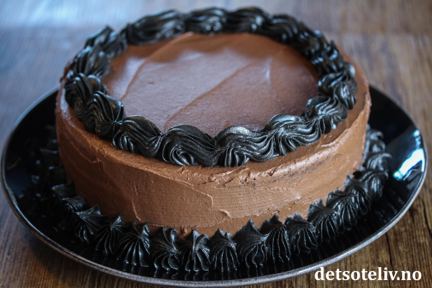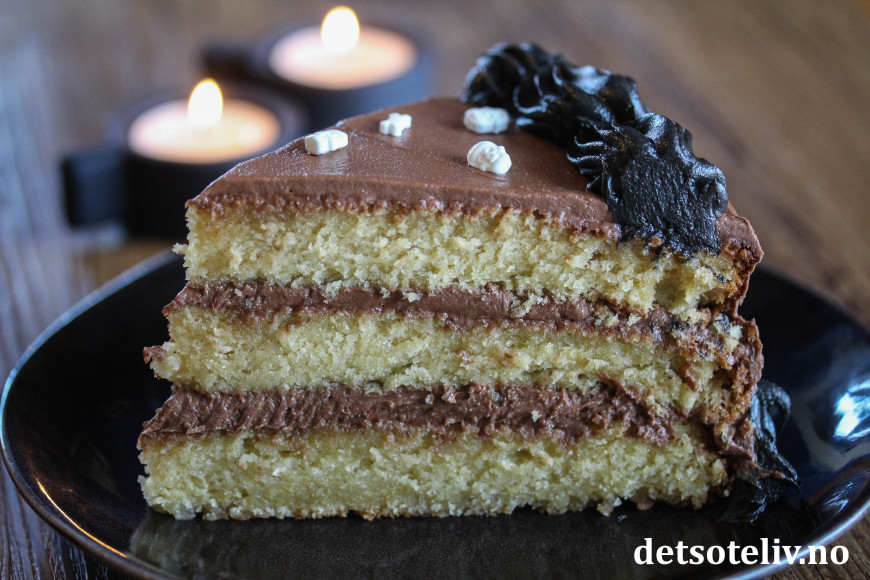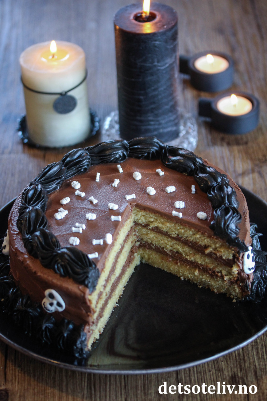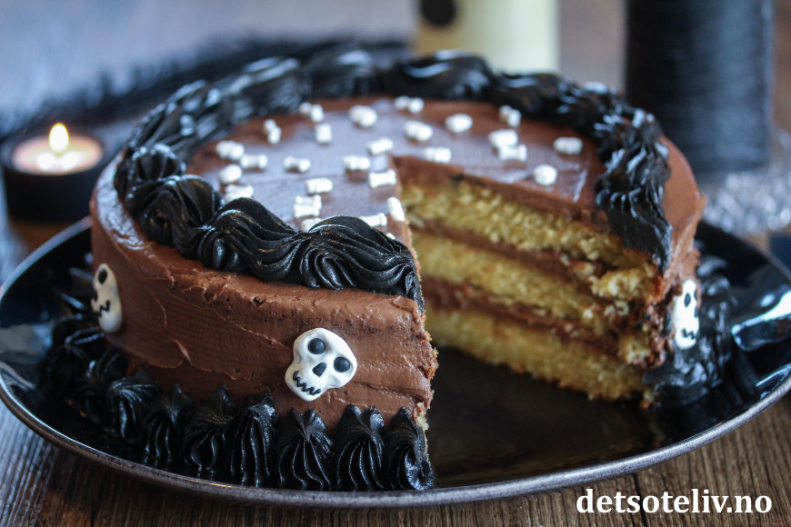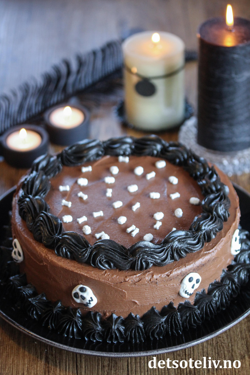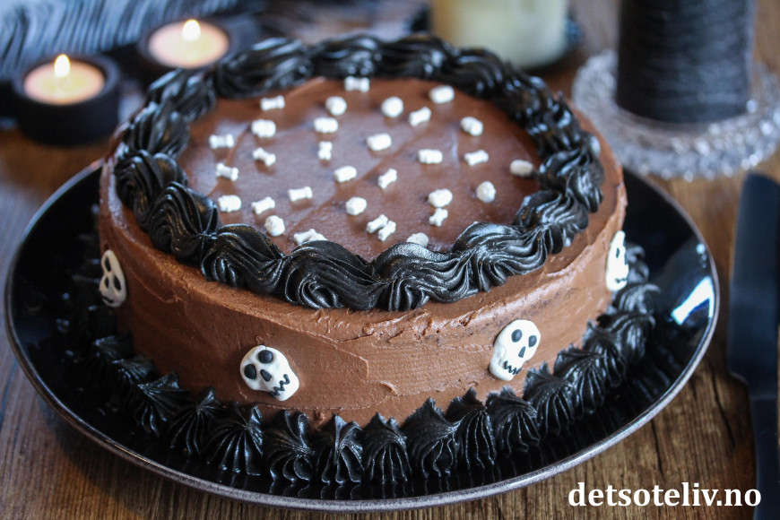 Det eneste jeg har gjort for å få Halloween-effekt på denne populære kaken, er å farge en del av sjokoladekremen med konsentrert, svart konditorfarge. I tillegg har jeg pyntet med strøssel og kakepynt i Halloween-tema.