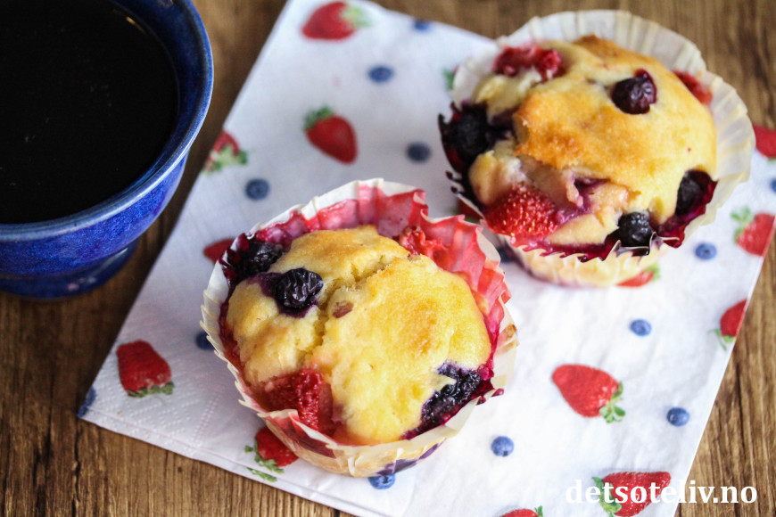 Her har du noen nydelige, sommerlige muffins med blåbær og jordbær. Vaniljekesam gir muffinsene saftighet og kjempegod smak.