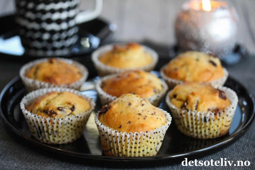 "Vaniljekesammuffins med sjokoladebiter" er lettlagde og kjempegode muffins! Den gode vaniljesmaken kommer av at deigen inneholder vaniljekesam!