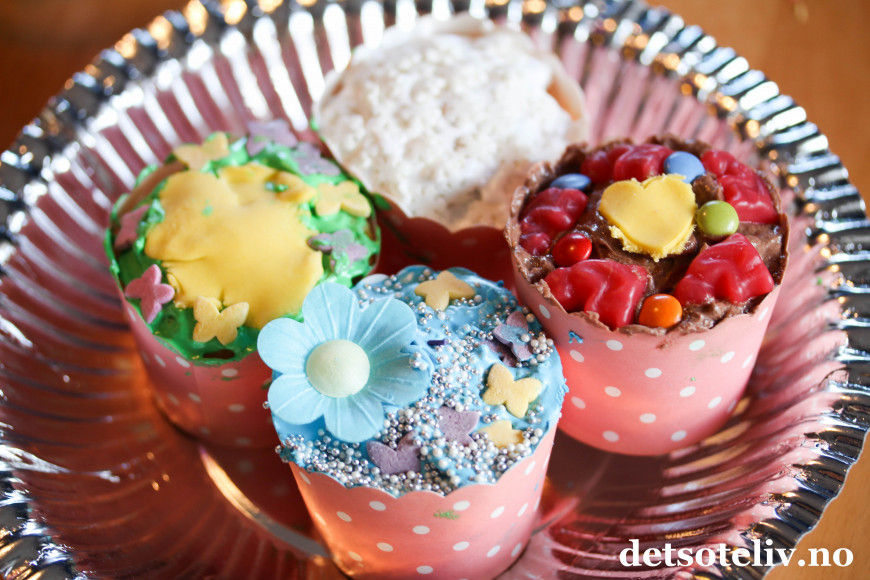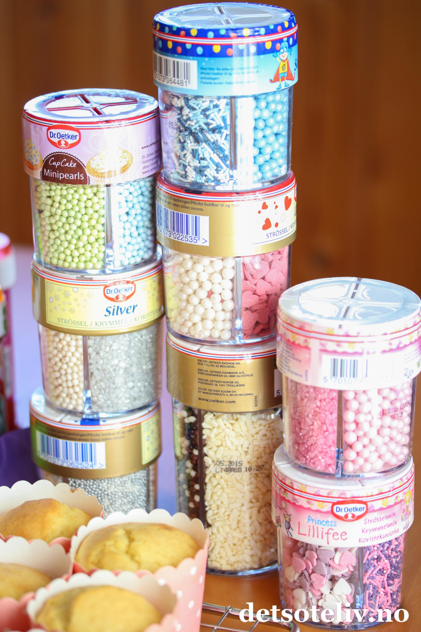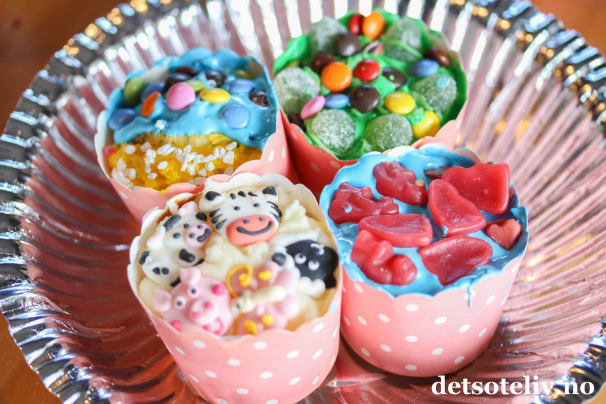 Jeg hadde stekt klart vaniljemuffinsene på forhånd, lagd og farget marengsglasur i flere farger og kjøpt inn masse kakepynt.