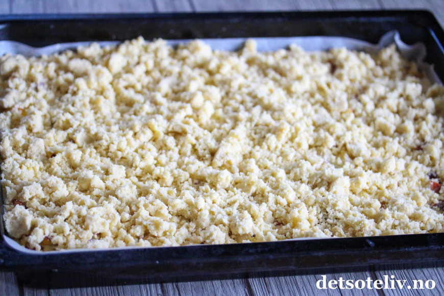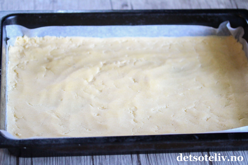 Finn frem en stor langpanne (ca 30x40 cm) og kle den med bakepapir. Klem mørdeigen godt utover i bunnen av langpannen.