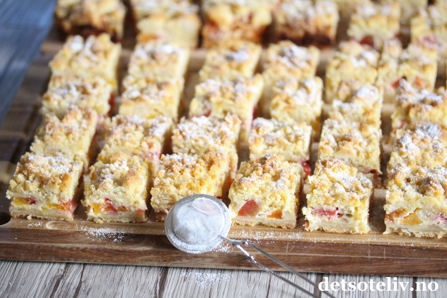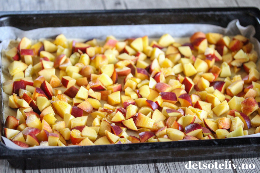 Rens frukten og del den i terninger. Fordel fruktbitene over deigen i langpannen.