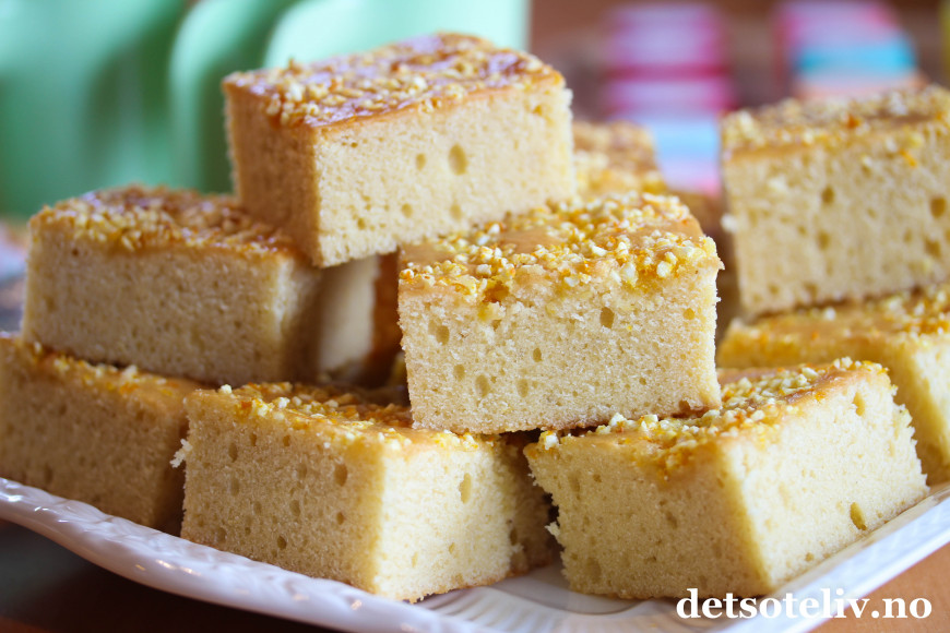 ♥ Perlesukkeret jeg har brukt på denne kaken er mer grovkornet enn norsk perlesukker og holder seg hvitt under stekingen. Perlesukkeret er kjøpt i Sverige (fra Dansukker). Det går like fint å bruke vanlig norsk perlesukker.