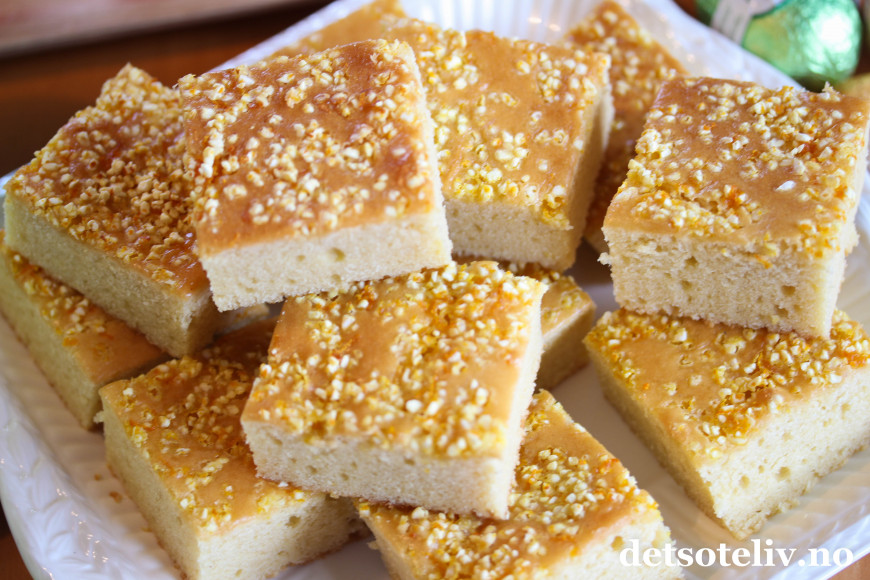 Stek kaken midt i ovnen ved 175°C i 40 min. Avkjøl kaken i formen. Del kaken i firkanter og løft ut av formen med en stekespade.
