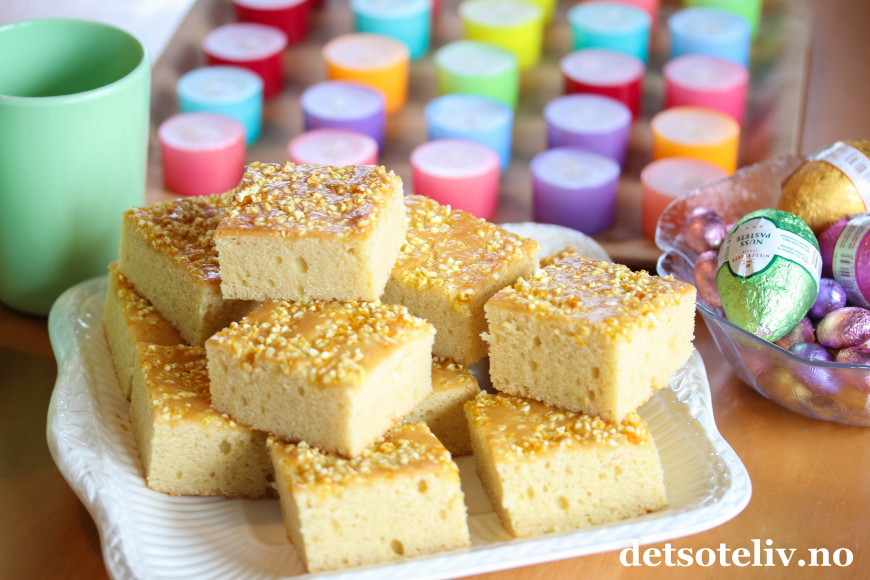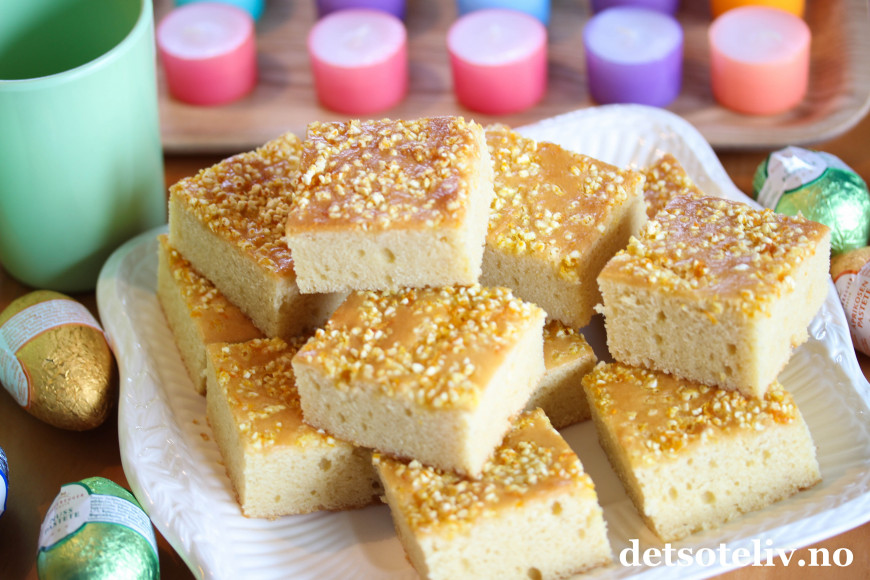 Denne langpannekaken har spesielt nydelig smak av vanilje og appelsin. Kaken er en variant av den populære Vaniljesauskaken, og presset saft fra appelsin i tillegg til vaniljesausen gir ekstra påskestemning.