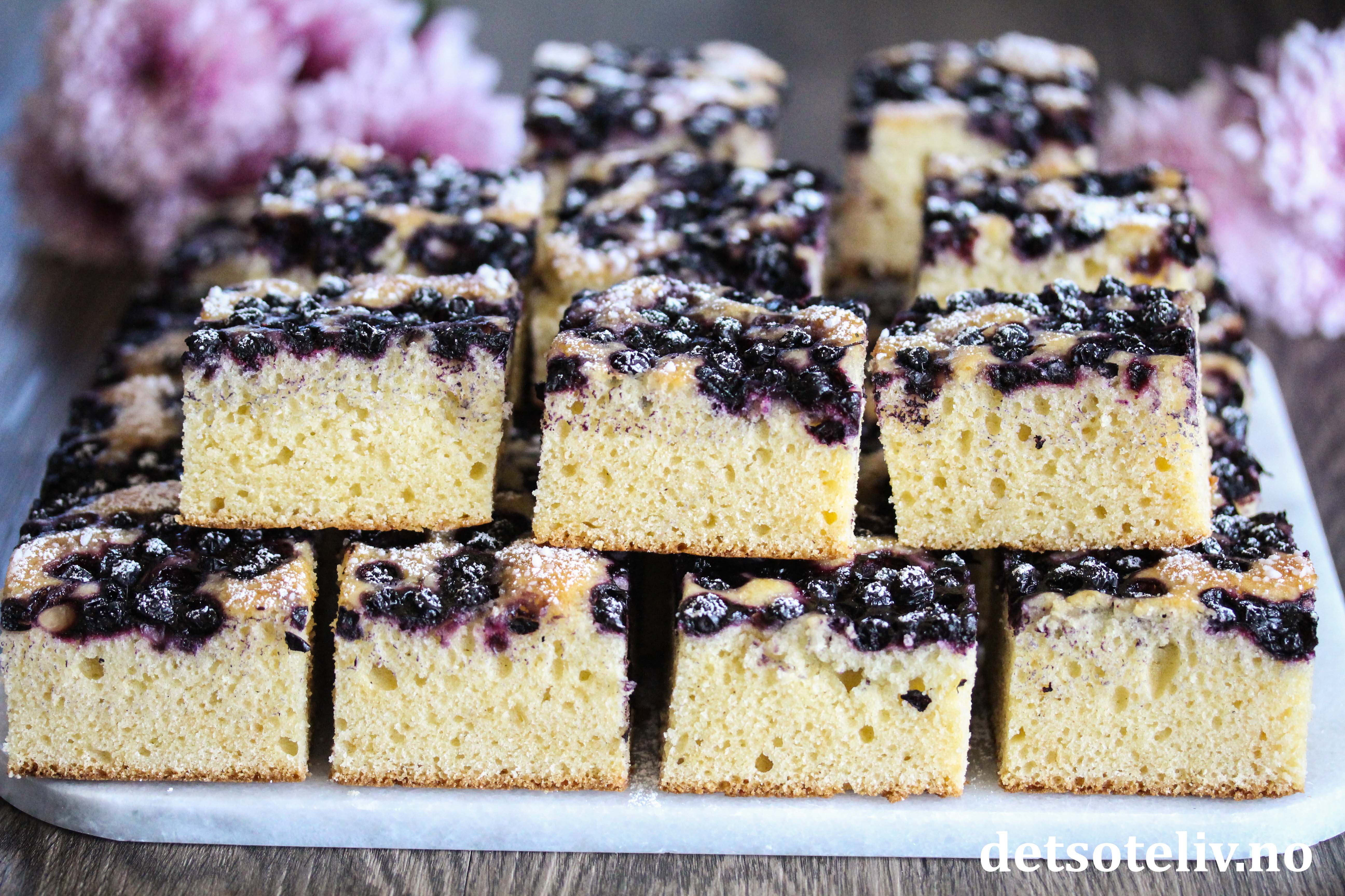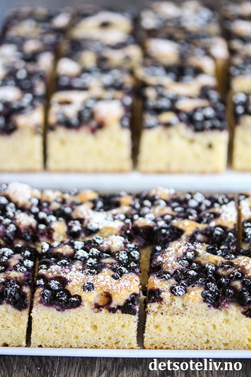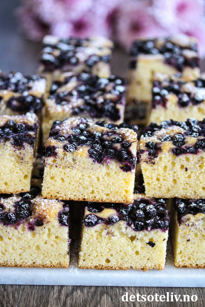 ♥ Jeg liker å bruke skogsblåbær til denne kaken. De gir best smak, og siden bærene er små, synker de ikke til bunns i kaken under stekingen. Det går greit å bruke frosne blåbær, og i så fall trenger de ikke å tines før du har dem over kakedeigen.