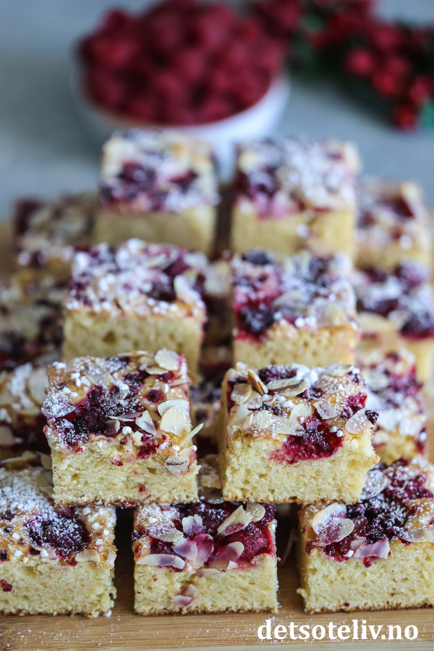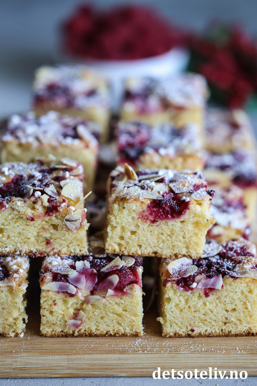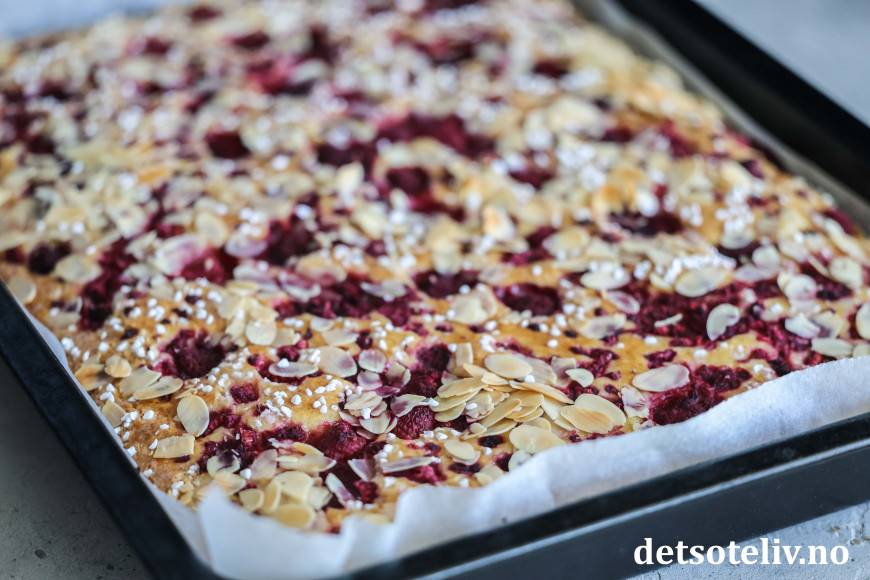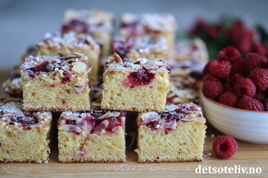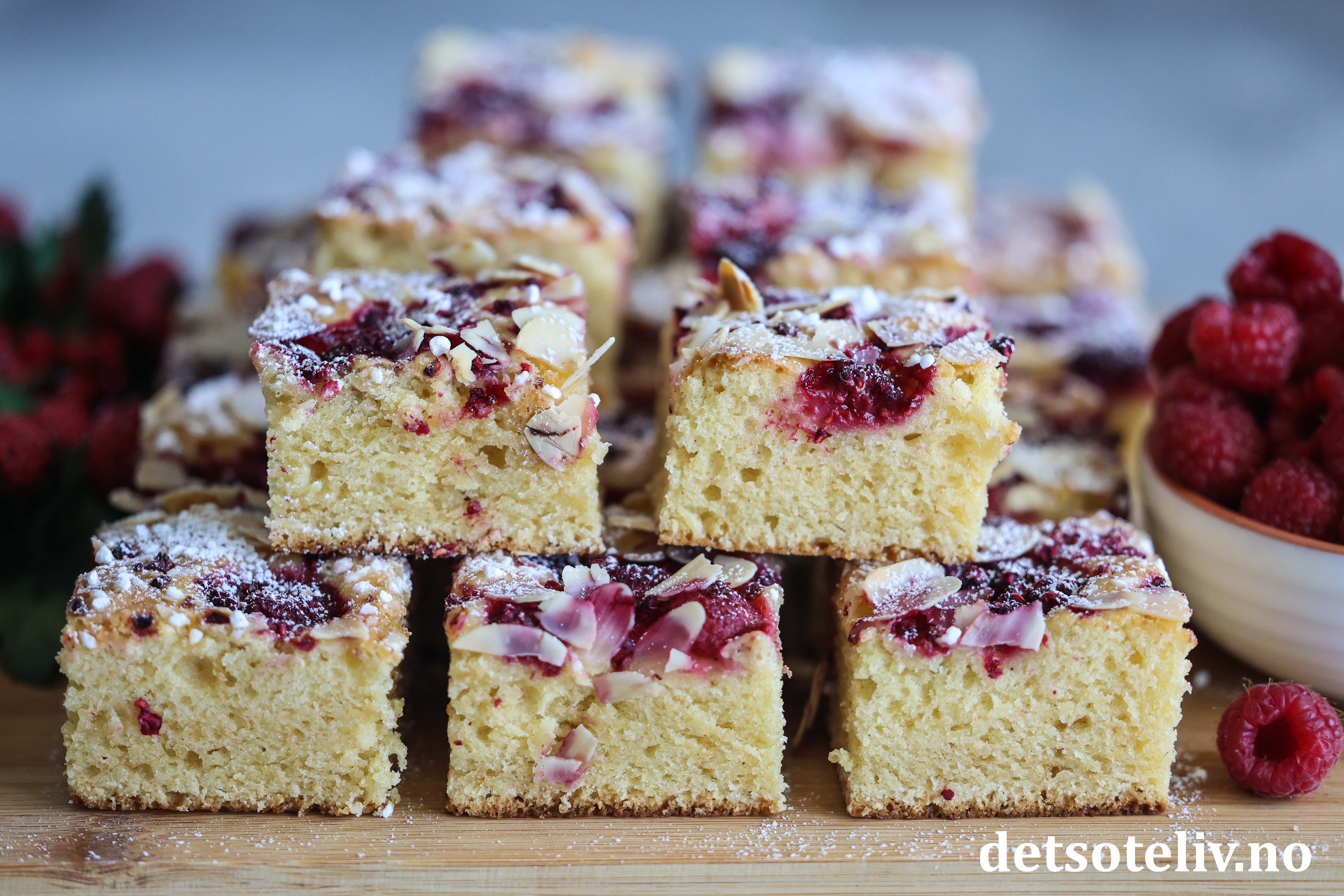 Jeg bruker en liter ferdigkjøpt vaniljesaus i deigen, og dette gir kaken en herlig, myk konsistens og deilig vaniljesmak. Kakedeigen er superrask å røre sammen. Du finner mange varianter av vaniljesauskaken her på Det søte liv, og nå også en variant med bringebær. 😃