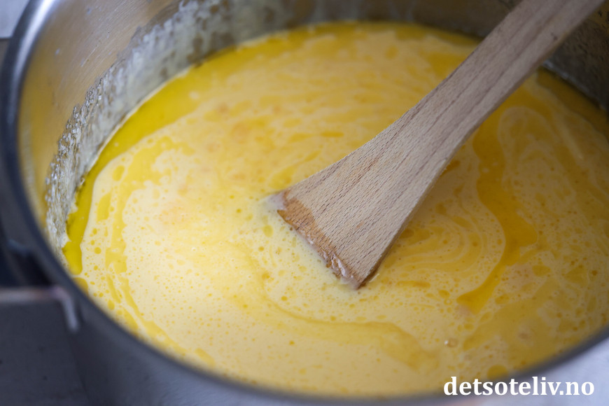 Ha vaniljesaus, smør og sukker i en kjele og varm opp på middels varme under omrøring til smøret har smeltet og alt er godt blandet. Avkjøl noe.