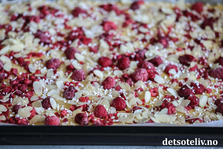 Fordel over bringebær. Dryss over mandelflak og perlesukker.