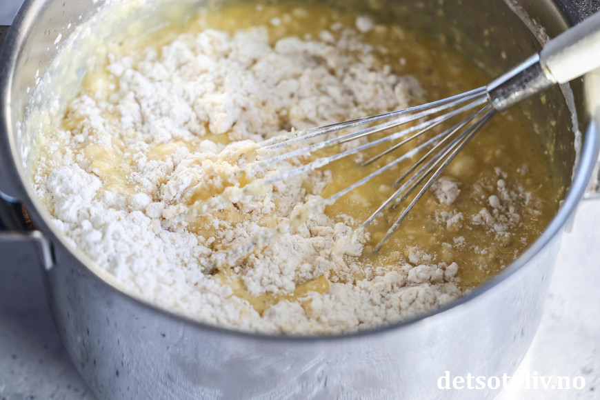 ♥ Rør minst mulig i deigen etter at du har tilsatt melet for å unngå at deigen blir seig. Jeg rører kun helt kort for hånd med en ballongvisp til deigen er blandet.