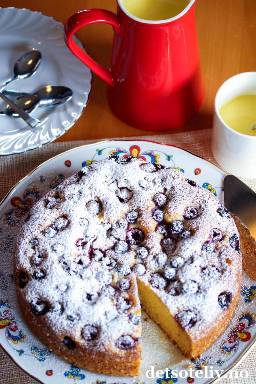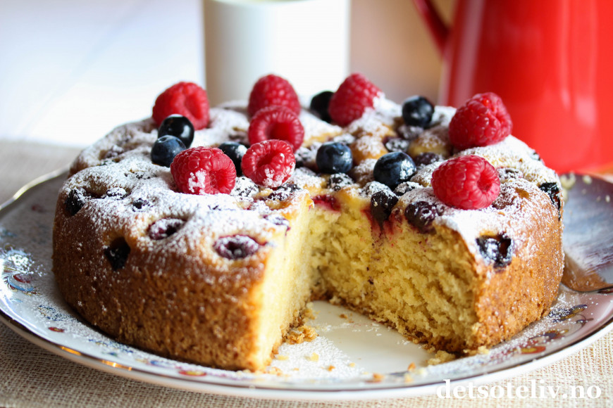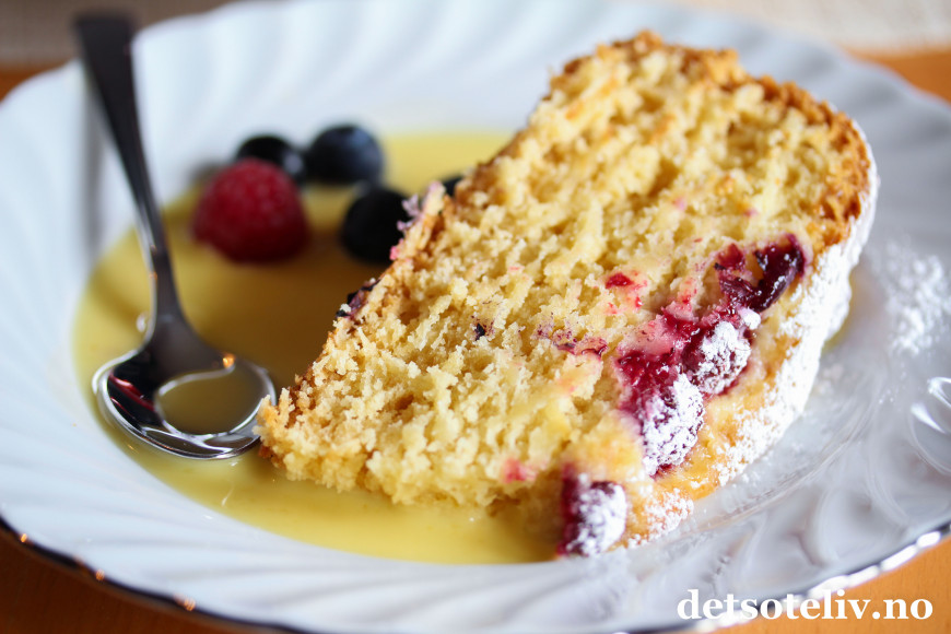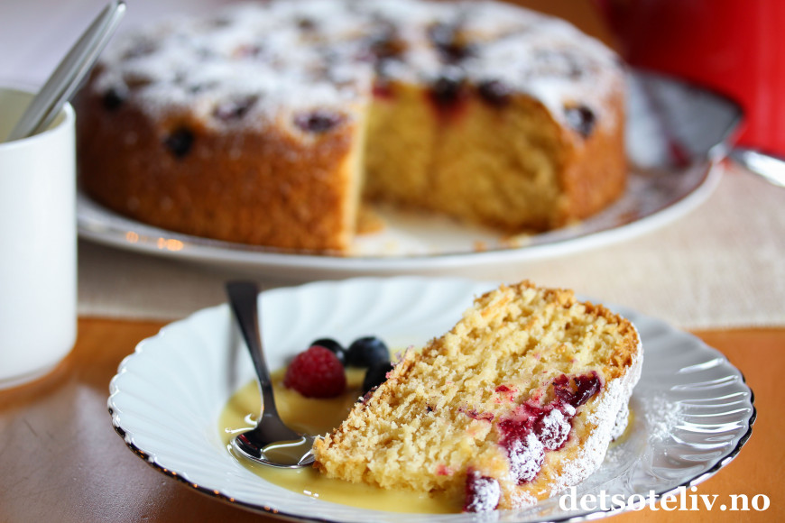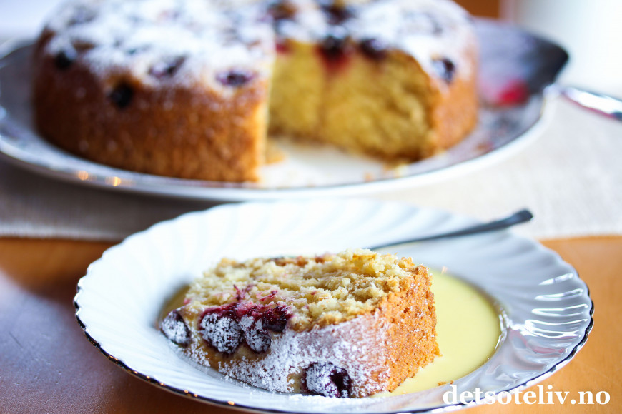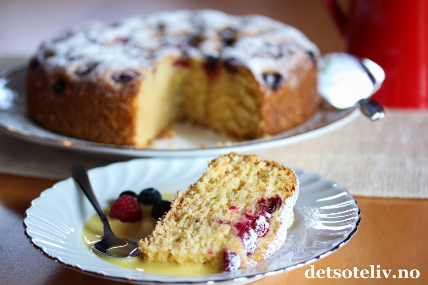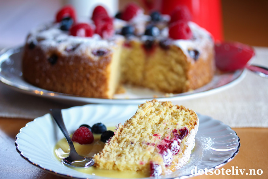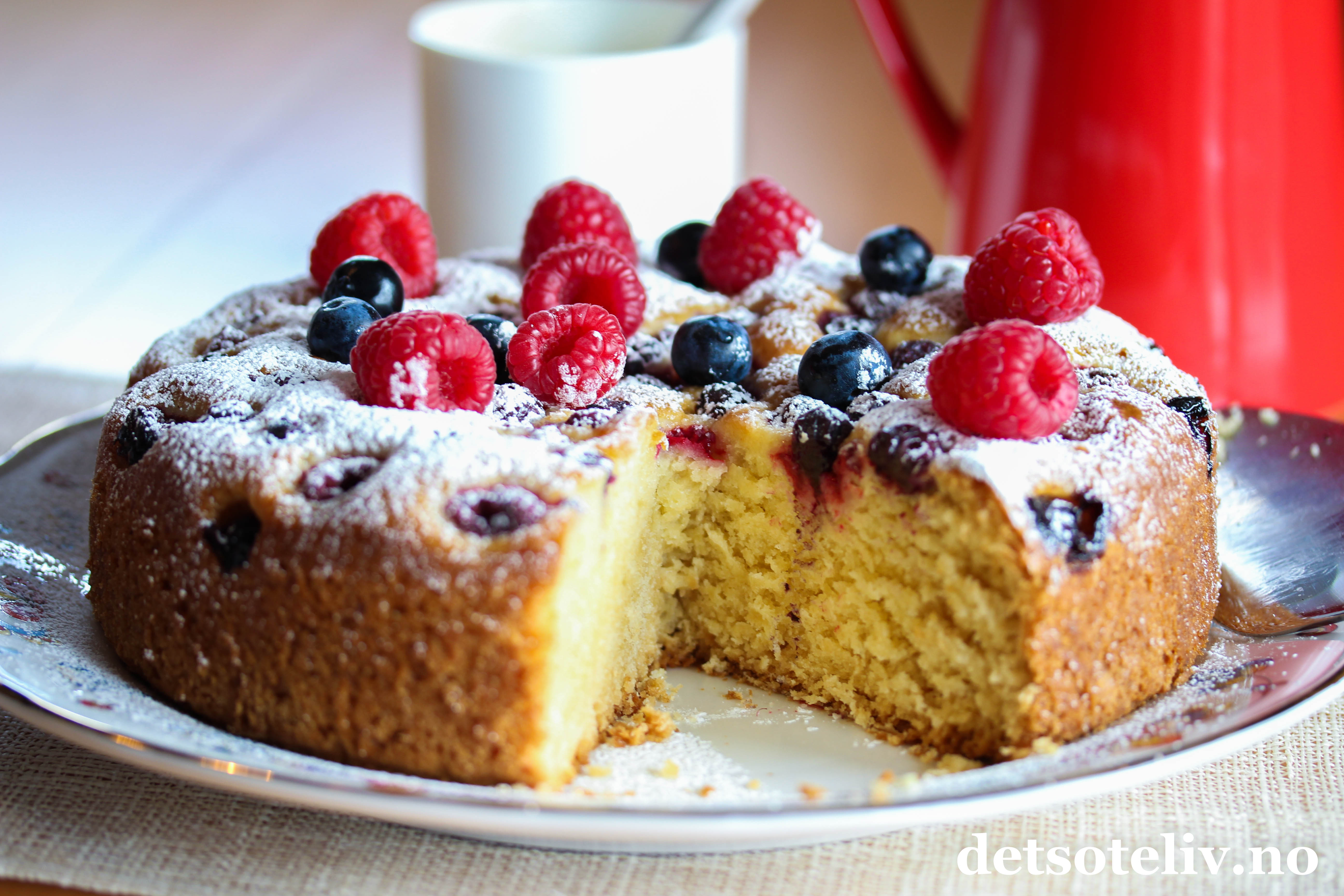 Kaken er myk og deilig, og har kjempegod smak av vanilje fordi den inneholder vaniljesaus i deigen. Kaken blir sommerlig og vakker med friske bær som legges på kaken både før steking og etter steking.