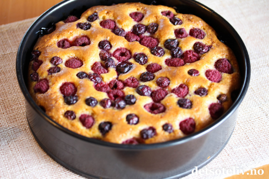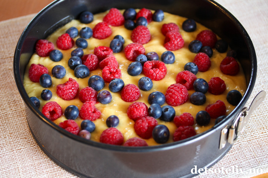 Hell deigen i en rund form (24 cm i diameter) med bakepapir i bunnen. Dryss på bærene.
