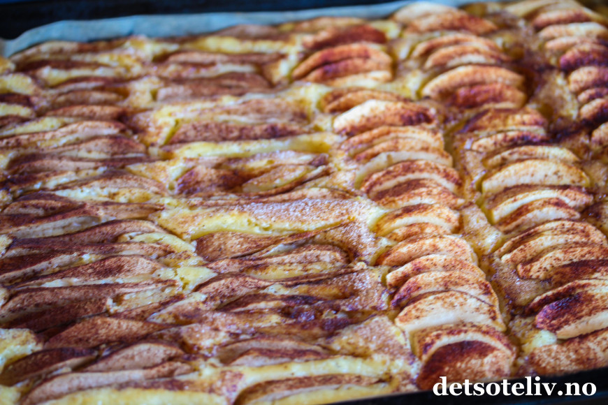 Denne gangen testet jeg å lage halvparten av langpannekaken med epler og halvparten med pærer, og resultatet ble supervellykket!