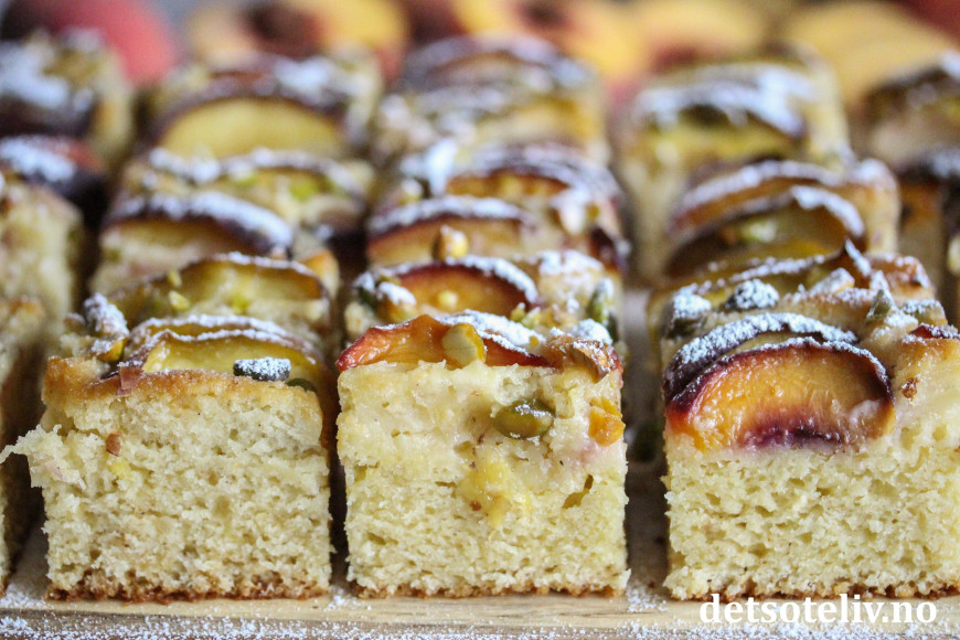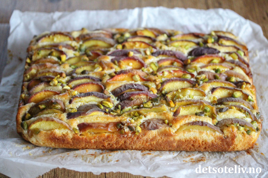 Del fersken i skiver og stikk dem tett i tett i deigen i et pent mønster. Strø over sukker og hakkede pistasjnøtter, hvis du liker det.