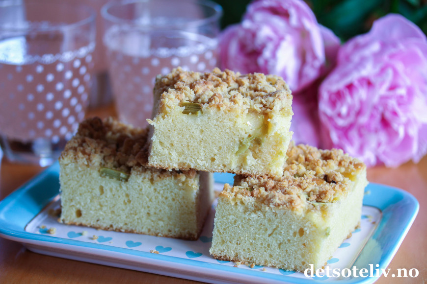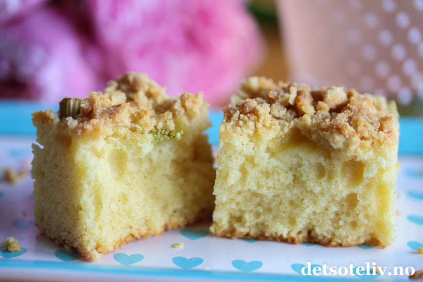 Her har jeg dekket kaken med små biter rabarbra og strødd over havrecrumble med vanilje, som gir deilig smak og crunch til kaken.