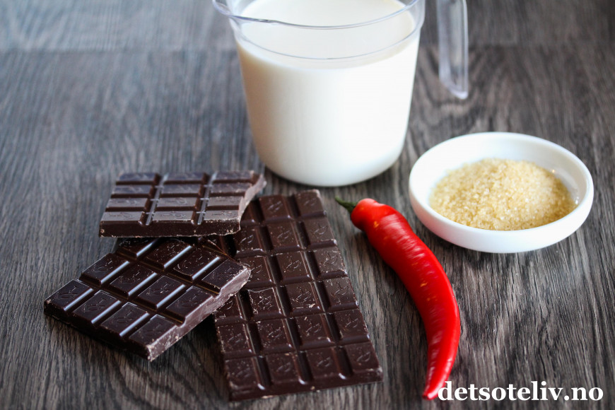 Ha melk og sukker i en kjele og varm opp til kokepunktet. Ta kjelen av platen og tilsett oppdelt sjokolade og hakket chili. Rør til sjokoladen har smeltet. Smak til med en god skvett konjakk.