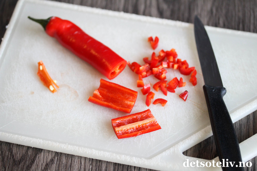 Jeg gjør deretter klar chilien. Del den på midten og skrap ut alle frø på innsiden. Skyll chilien kort i rennende vann og hakk den i små biter (pass nøye på at du ikke tar deg i øynene, for det kan svi nokså ille).