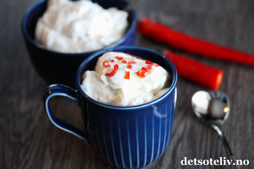 Legg på en god klatt pisket krem og dryss eventuelt over litt finhakket chili på toppen.