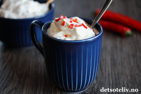 Fyll den varme sjokoladen i kopper. Legg på en god klatt pisket krem og dryss eventuelt over litt finhakket chili på toppen.